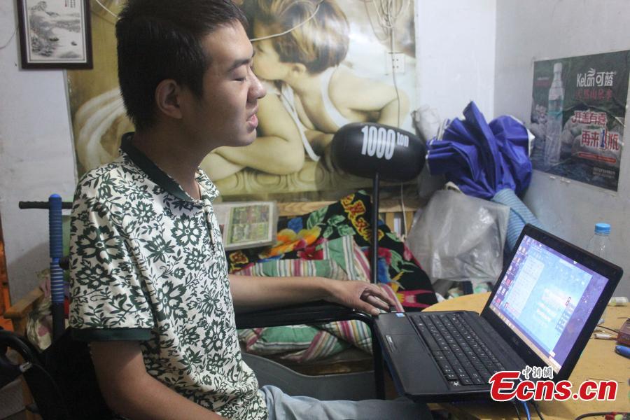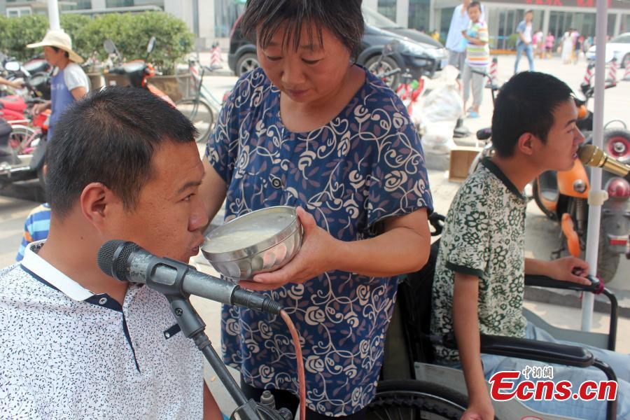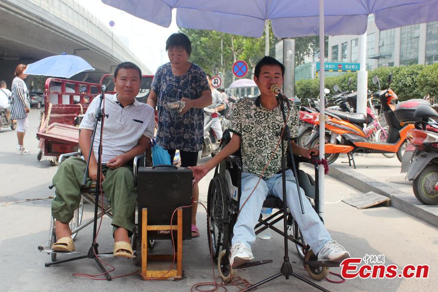 Zhu Xiaoqiang, 31, and his younger brother Zhu Xiaomeng, 22, were diagnosed with Amyotrophic Lateral Sclerosis (ALS) respectively at the ages of 8 and 10. Accompanied by their mother Lv Aimei, the two ALS sufferers are now making living through singing on streets in Zhengzhou city of Henan province. [Photo/Ma Yiheng]