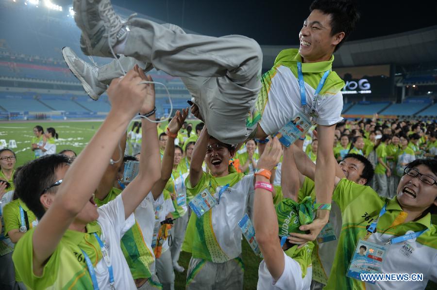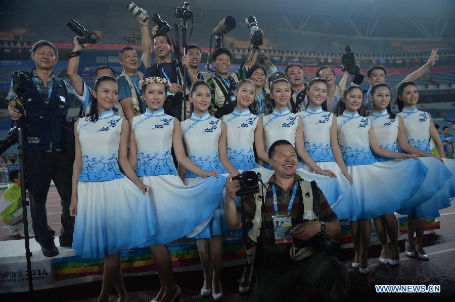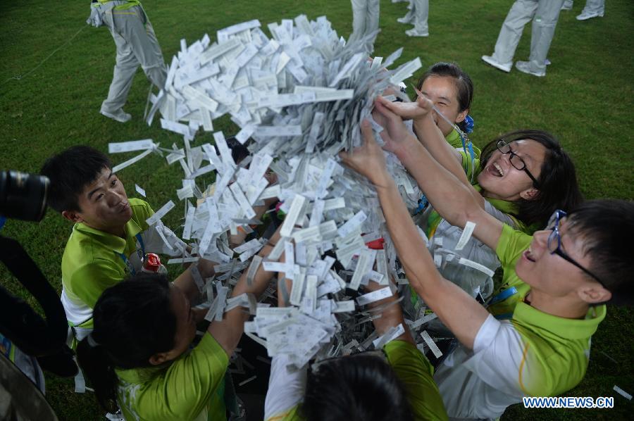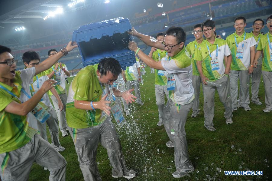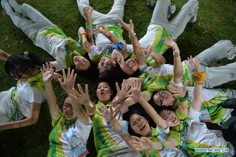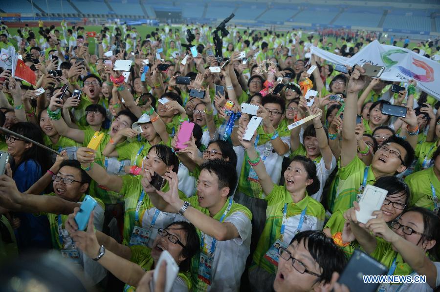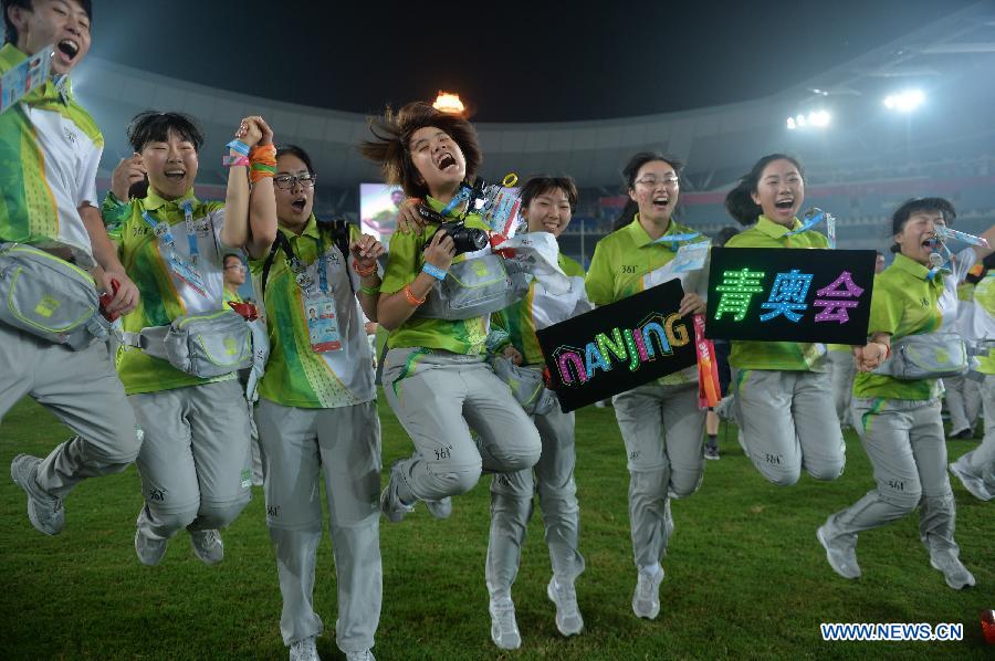 Volunteers pose for a photo during a farewell party in the Nanjing Olympic Sports Center Stadium during the Nanjing 2014 Youth Olympic Games in Nanjing, capital of east China's Jiangsu Province, on Aug. 25, 2014. (Xinhua/Shen Peng)