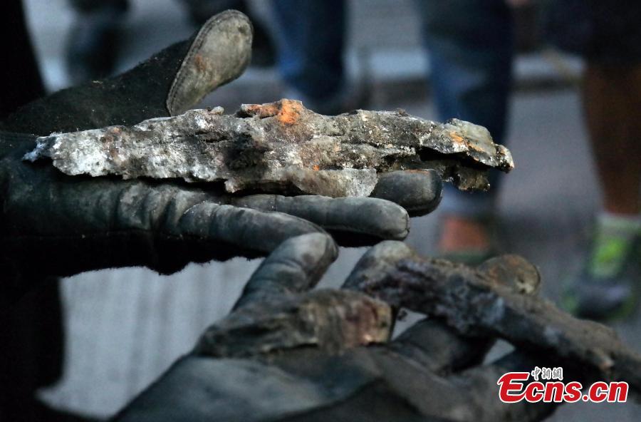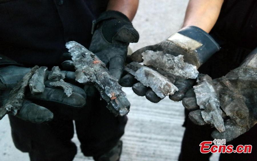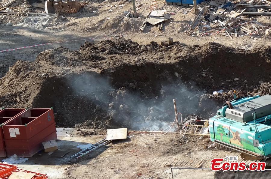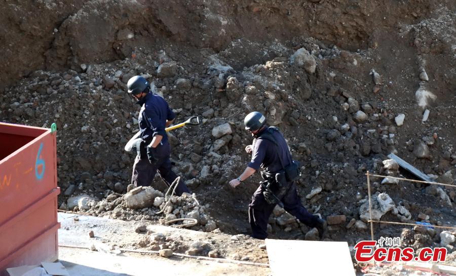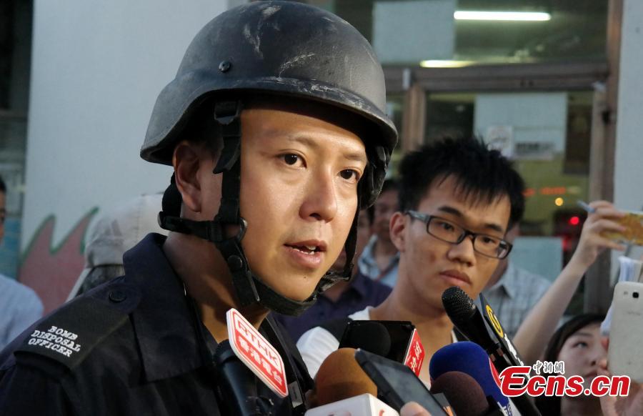 Police bomb disposal officers try to destroy a Japanese wartime explosive with a controlled blast in North Point of Hong Kong on August 26, 2014. The 15cm-long armor-piercing bomb was left by the Japanese army after the World War Two. It was discovered by workers at a construction site next to the North Point Ferry Pier on August 26. [Photo: China News Service/ Zhang Yu]
