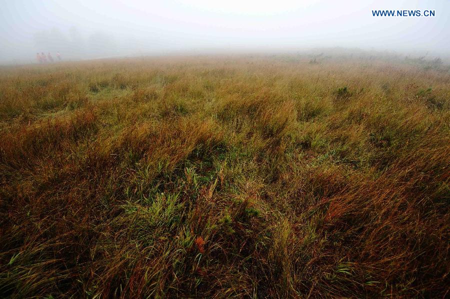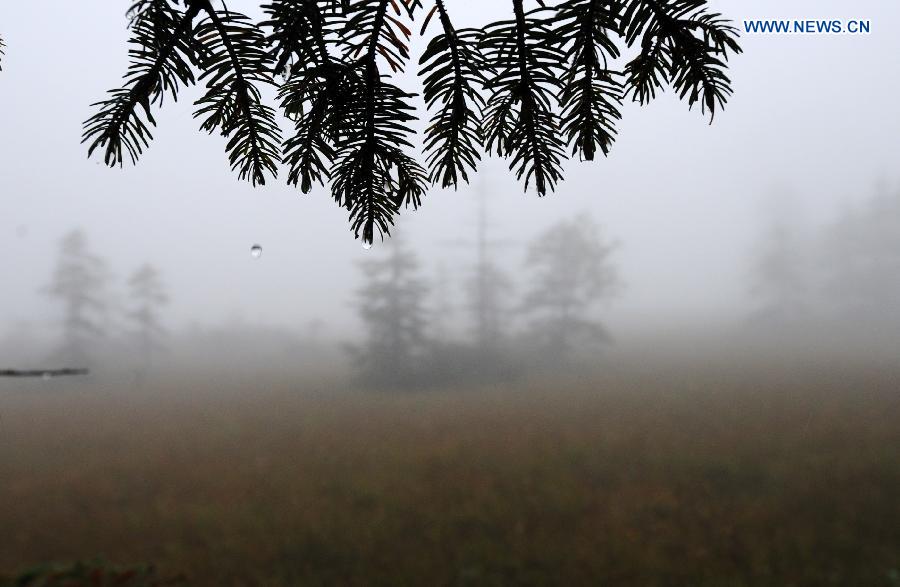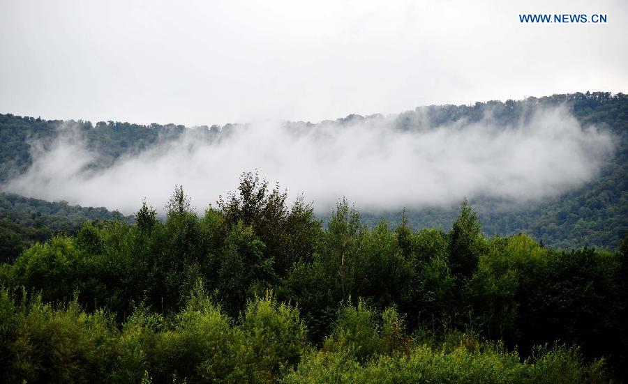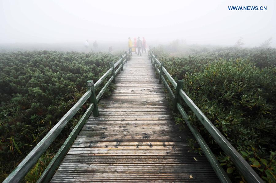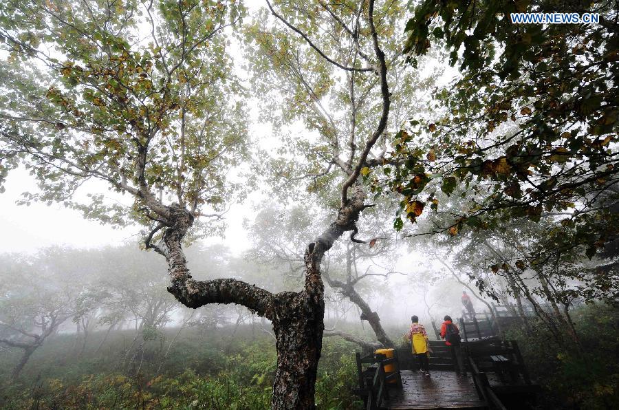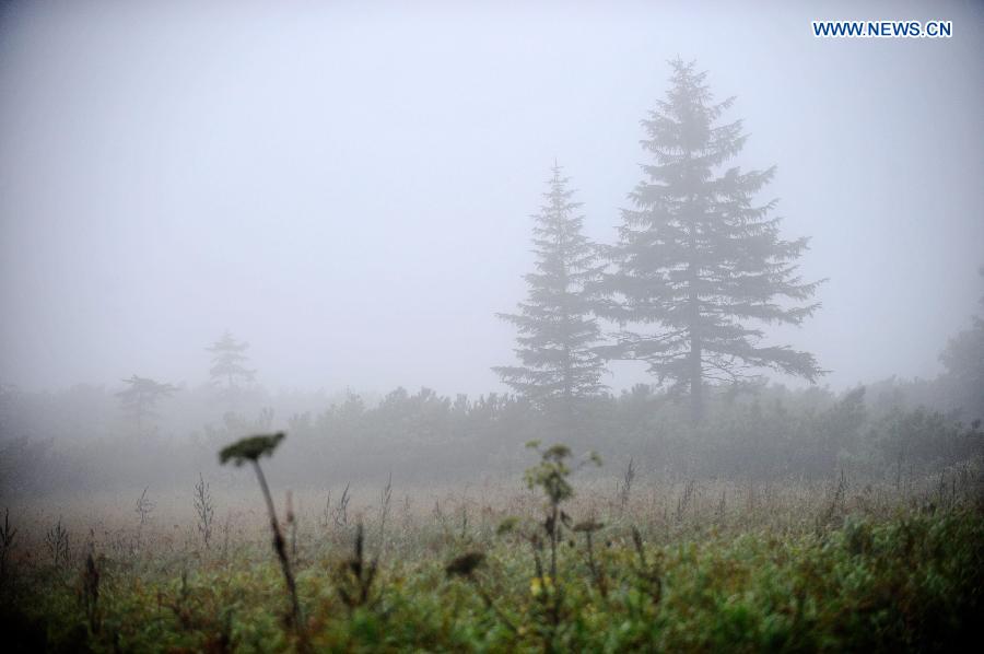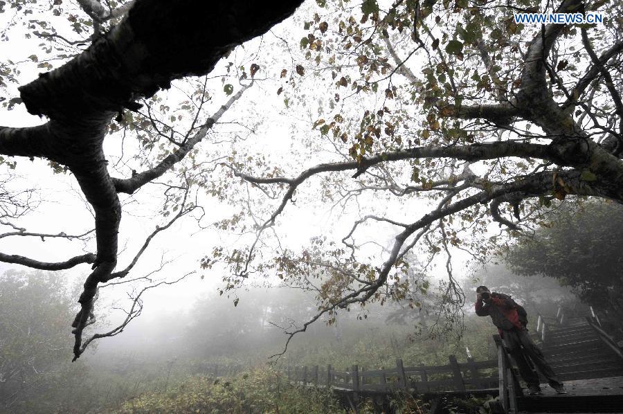 A visitor takes photos in the mist-covered Fenghuang Mountain in Wuchang, northeast China's Heilongjiang Province, Aug. 26, 2014. (Xinhua/Wang Jianwei)