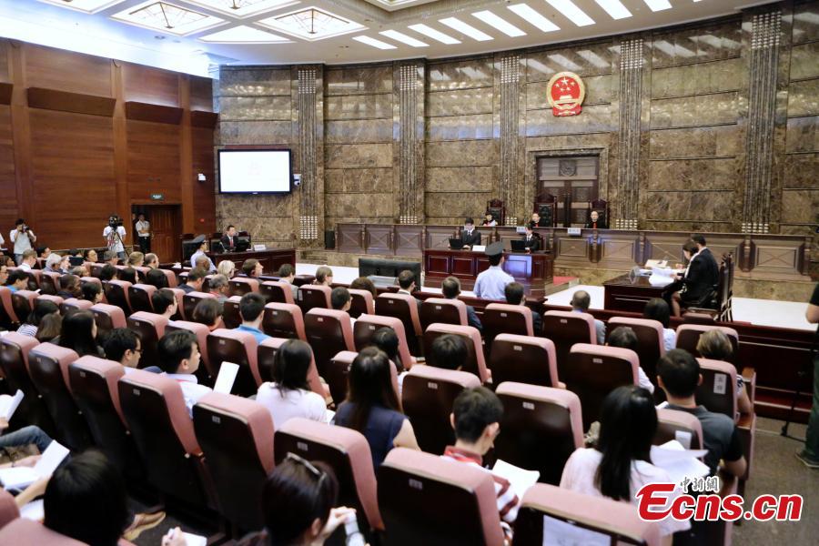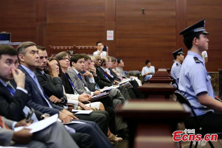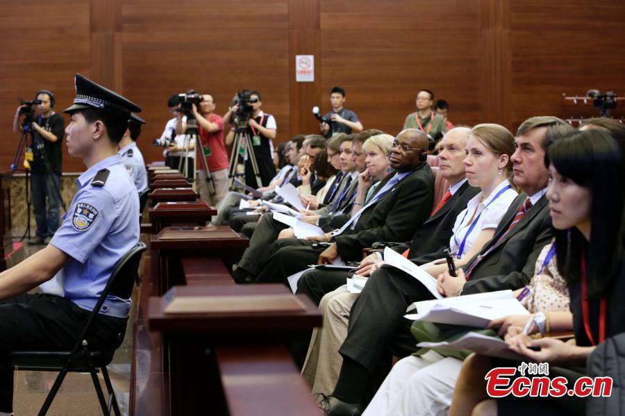 Foreign envoys are seen at an open court trial of Supreme People's Court in Beijing on Aug. 27, 2014. China's supreme court held an open day event for foreign envoys for the first time on Wednesday. Representatives and officials from 21 countries and international organizations took part in the activity. [Photo: China News Service / Li Huisi]
