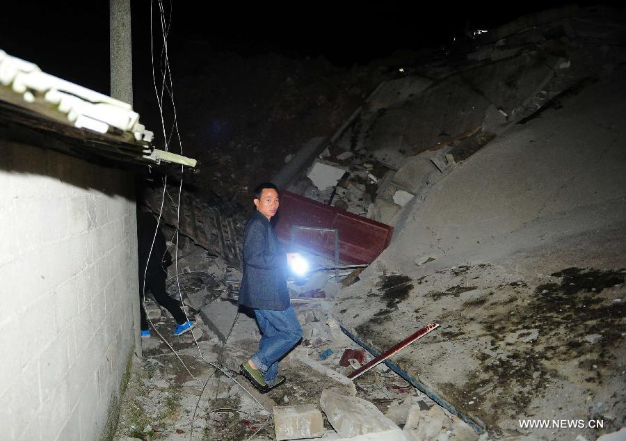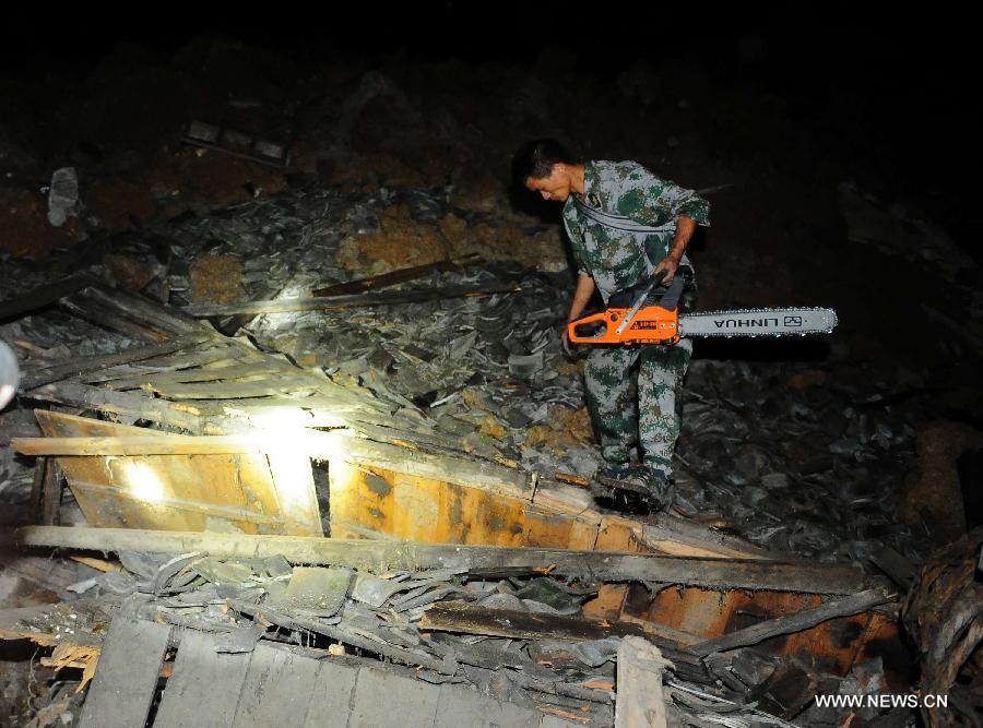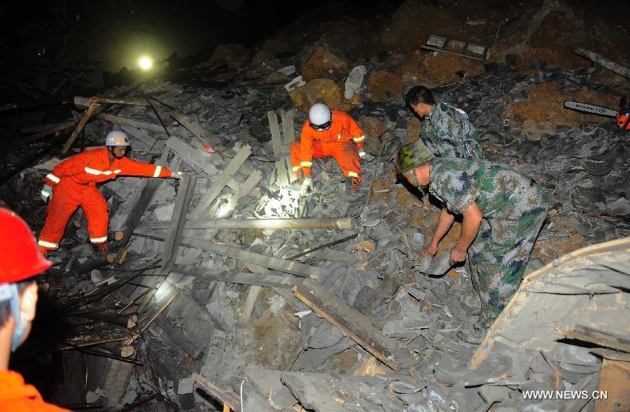 Rescuers work at the site of landslide in Yingping Village in Fuquan City, southwest China's Guizhou Province, on Aug. 28, 2014. One person was killed, and eleven remain missing after a landslide struck a village in southwest China's Guizhou Province on Wednesday night. (Xinhua/Liu Xu)
