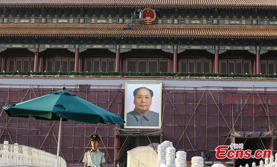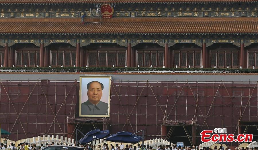 Red construction hoardings are seen set up around the Tiananmen Gate Tower which is under repairs in Beijing on August 27, 2014. It was the first time that the red-colored temporary fences, rather than the green ones were applied in renovation project for the tower. Those red hoardings were used to make sure the repairing work would not affect the external appearance of the building. [Photo: China News Service/ Zhang Hao]