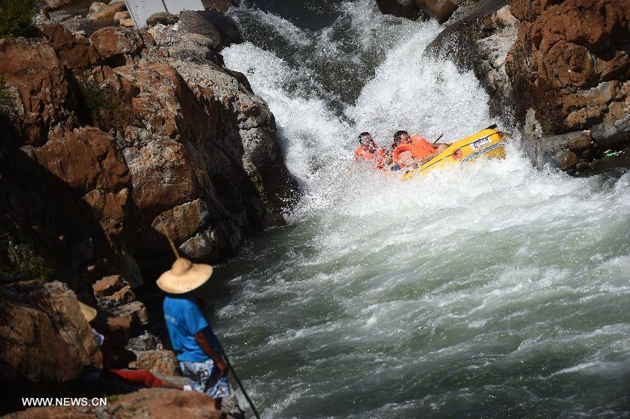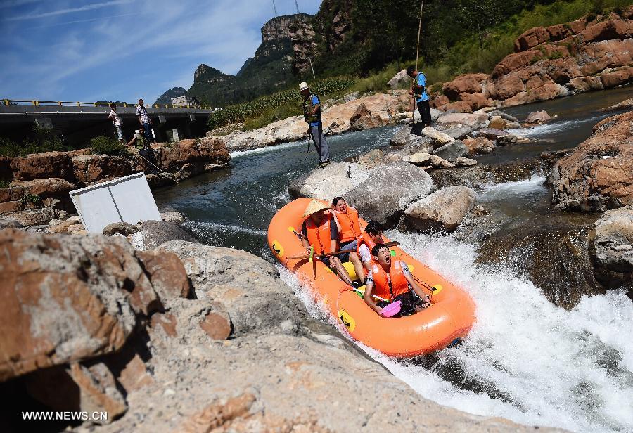 Tourists drift down a stream on Honghe River in Dashuiquan Township of Xinglong County, north China's Hebei Province, Aug. 27, 2014. (Xinhua/Jin Liangkuai)