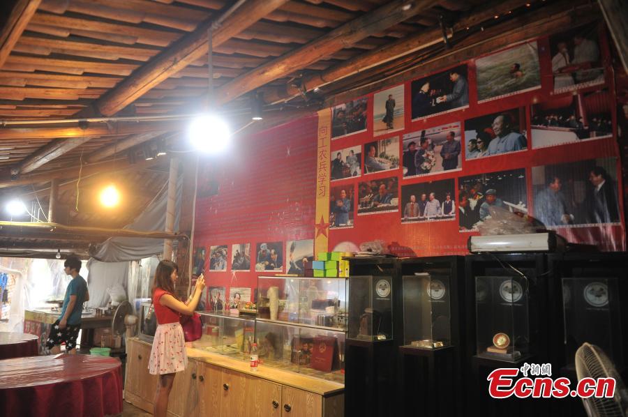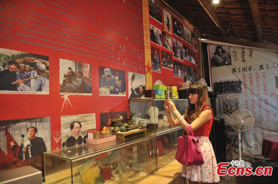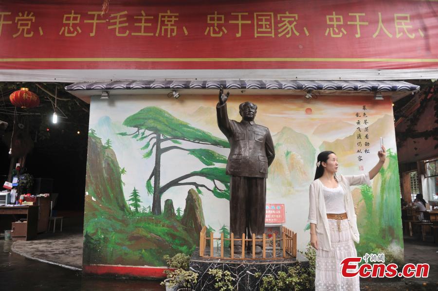 A customer takes a selfie at a Chairman-Mao-themed restaurant at Yangren Street, literally Foreigners' Street, in southwest China's Chongqing municipality on Aug. 28, 2014. [Photo/Chen Chao]