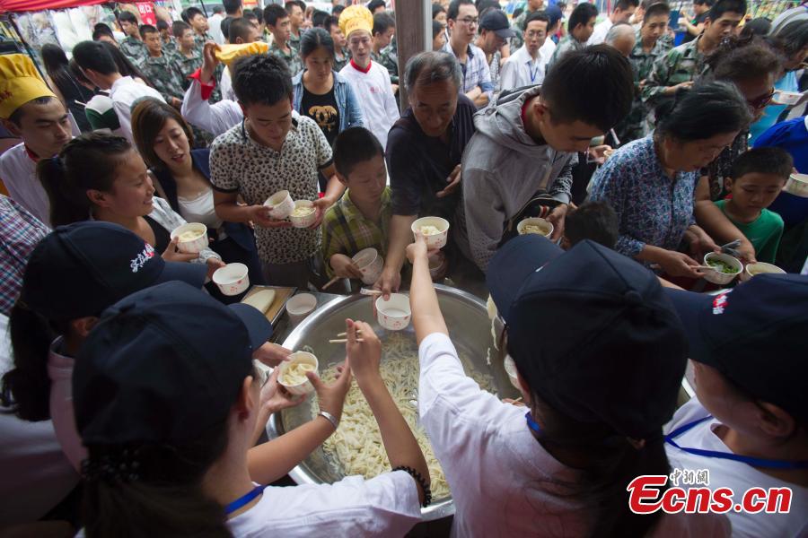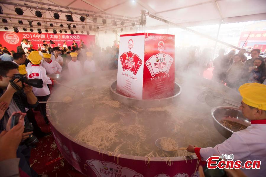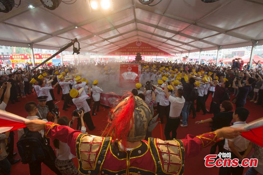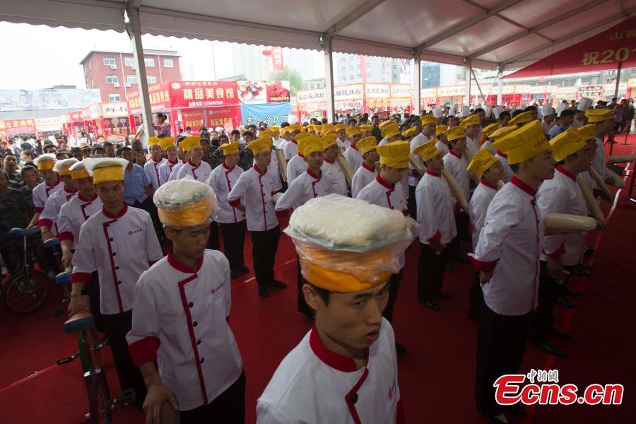 Chefs prepare to cook knife-shaved noodles for diners at an activity in Taiyuan, capital city of North China's Shanxi province on August 28, 2014. Attracting over 10,000 diners, the event is part of activities held to celebrate the city’s cultural festival themed on cooked wheaten food. Knife-shaved noodle is a kind of traditional dish for Shanxi people. [Photo: China News Service/ Zhang Yun]