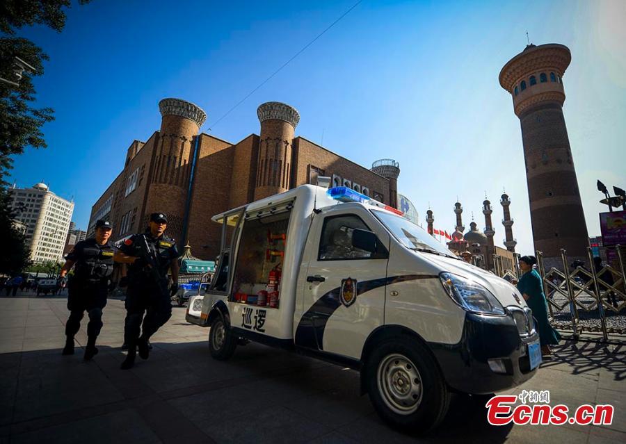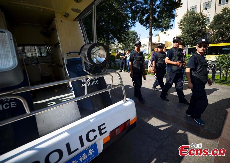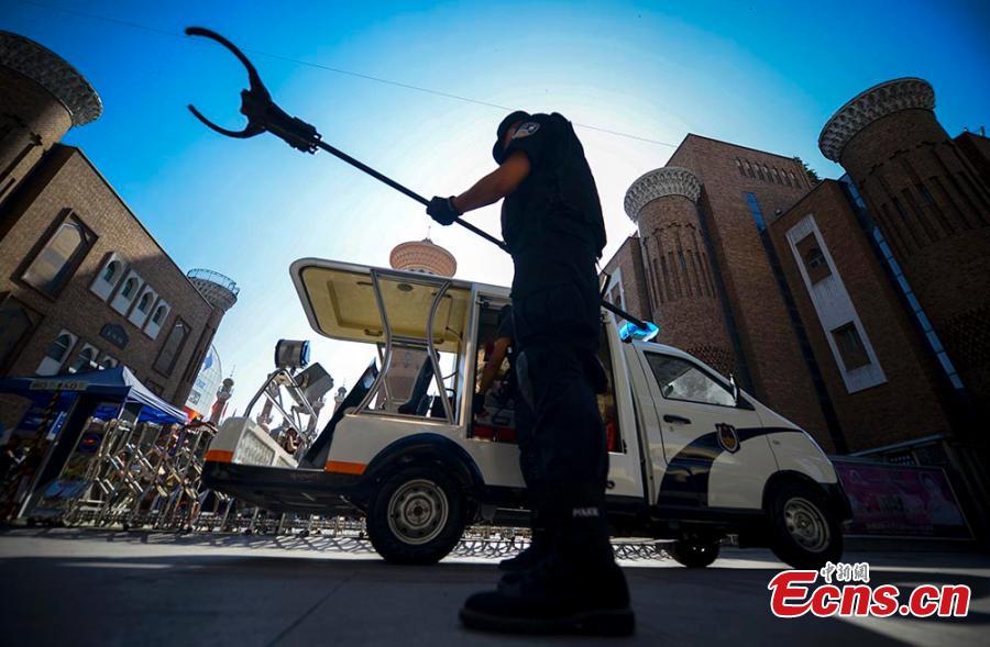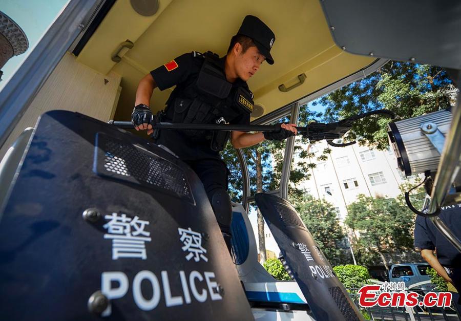 A new type of anti-terror vehicle is seen on street in Urumqi, capital of Northwest China's Xinjiang Uygur Autonomous Region on August 28, 2014. The electric-powered car is installed with advanced equipments such as police searchlight, real-time monitoring device, and other police equipments. [Photo/ Liu Xin]