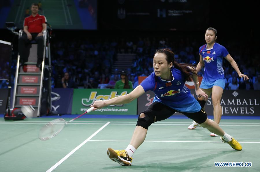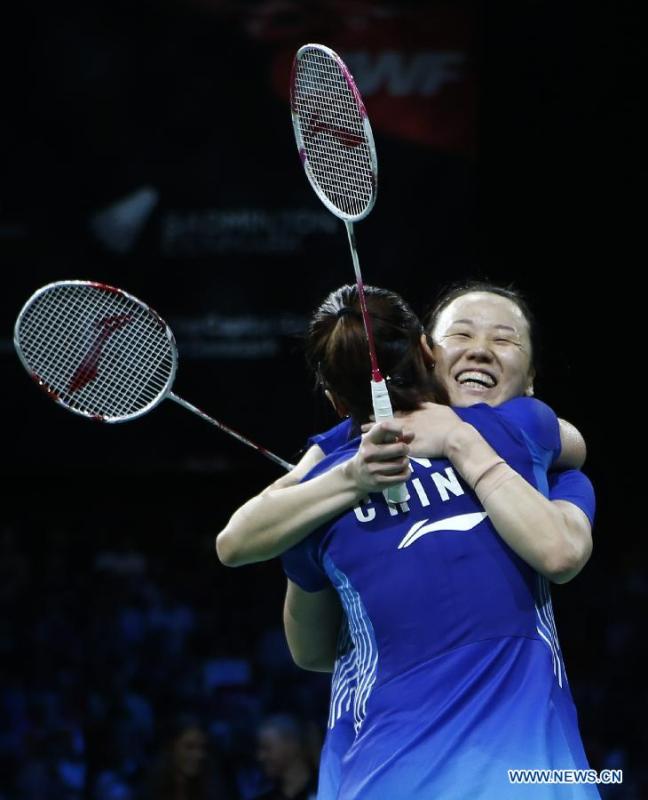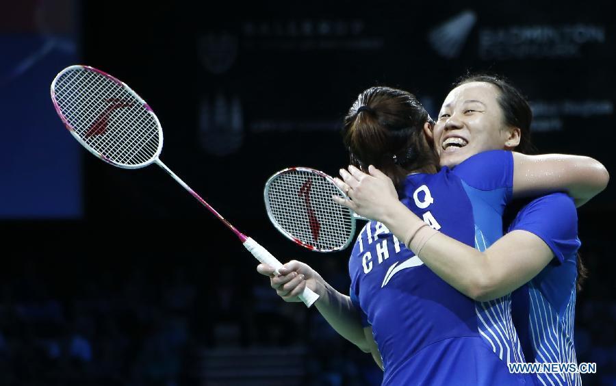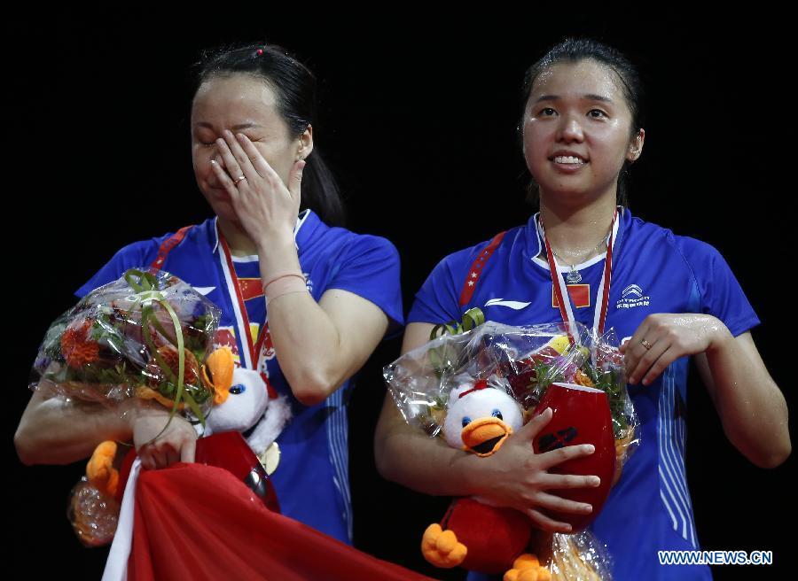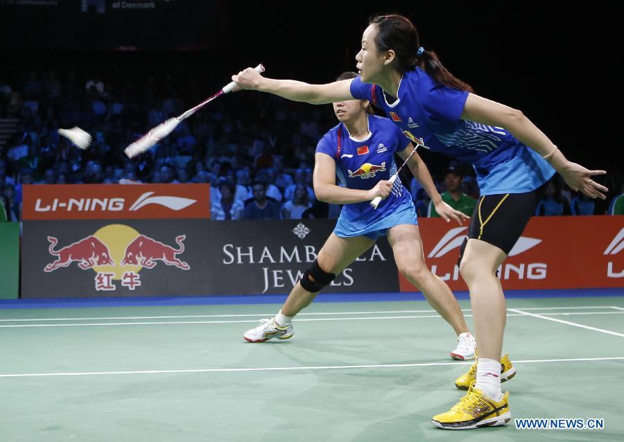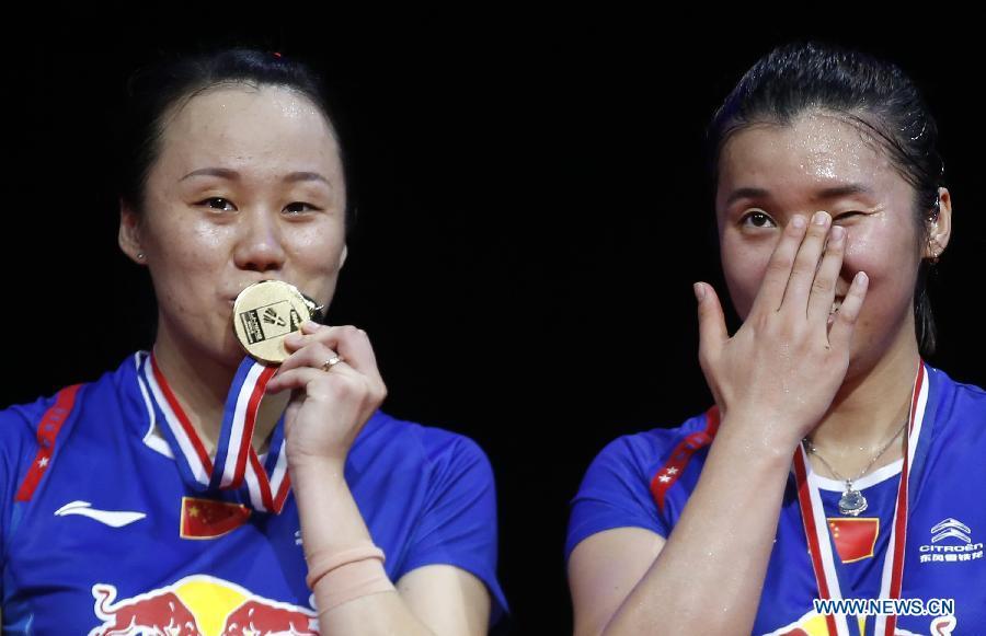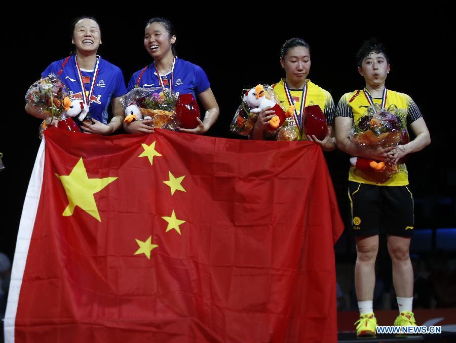 Tian Qing and Zhao Yunlei (4th R) of China celebrate during the awarding ceremony for the Women's Doubles Final on Day 7 of Li Ning BWF World Championships 2014 at Ballerup Super Arena in Copenhagen, Denmark on Aug 31, 2014. Tian and Zhao claimed the championship title by beating their teammates Wang Xiaoli and Yu Yang with 2-0 (21-19, 21-15). (Xinhua/Wang Lili)