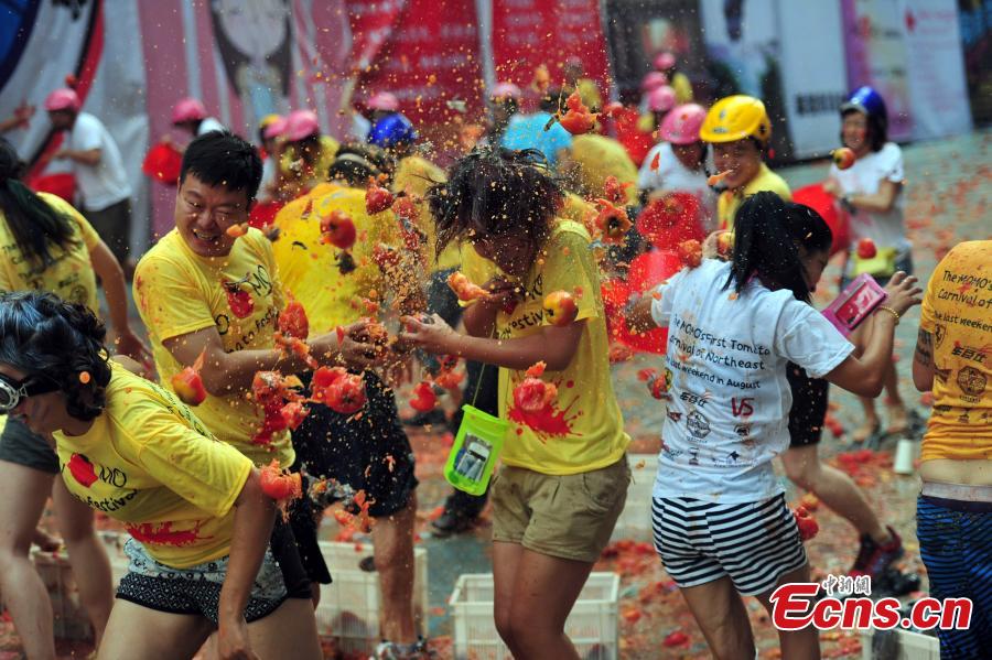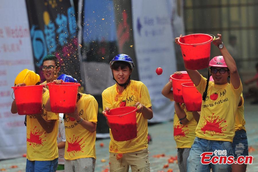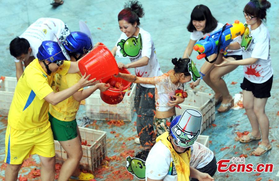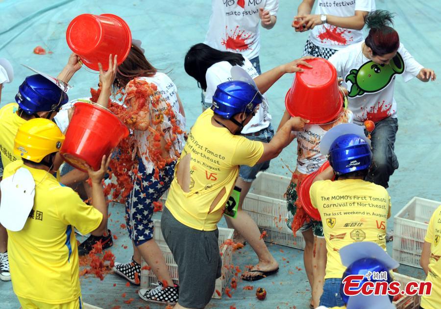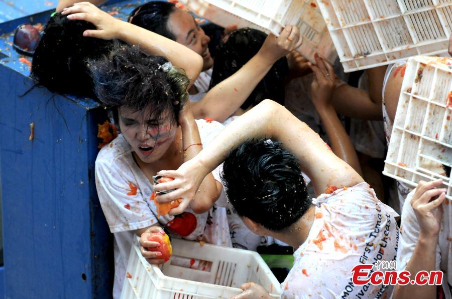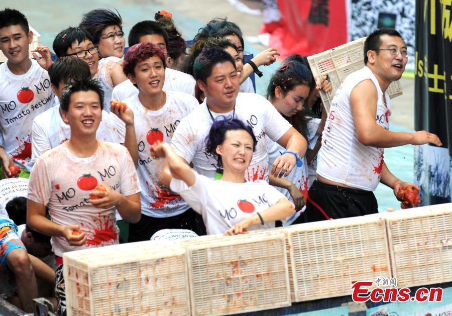 People have fun during a tomato fight in Shenyang city of northeast China's Liaoning province on Aug. 31, 2014. The fight attracted over 400 young persons from home and abroad. [Photo: China News Service / Yu Haiyang]