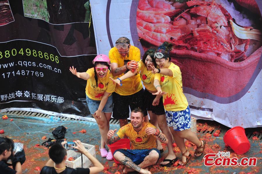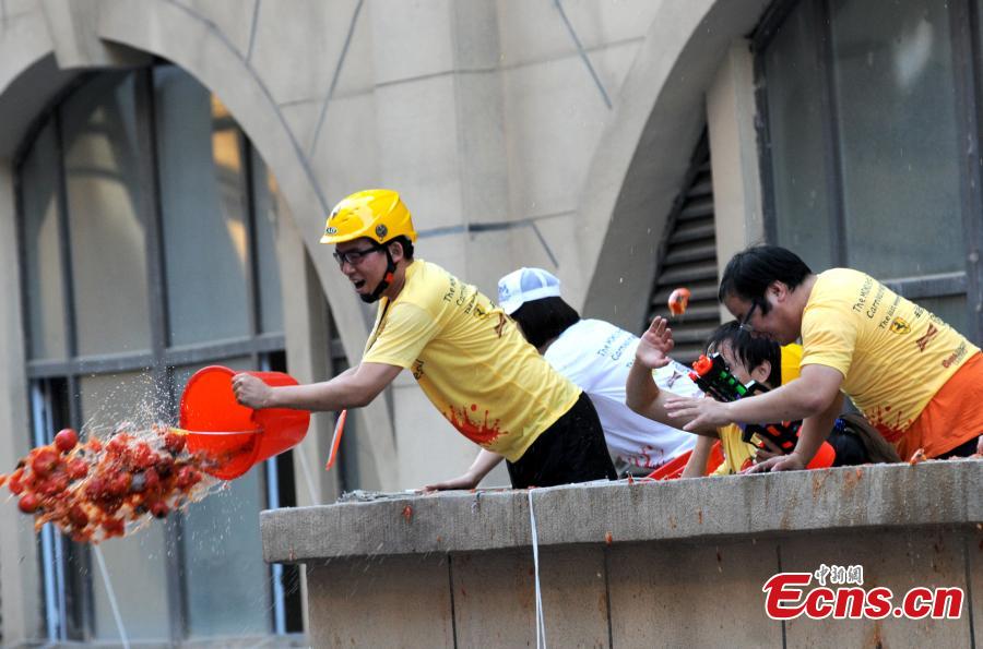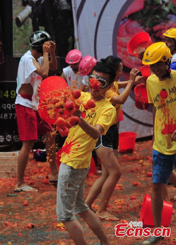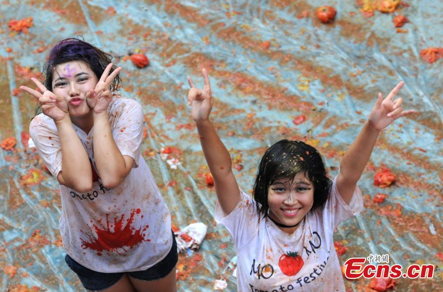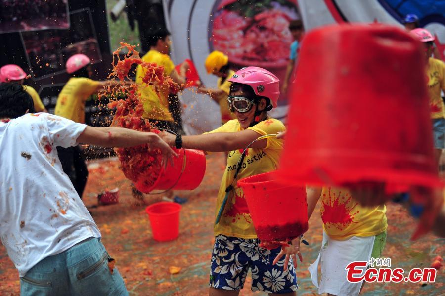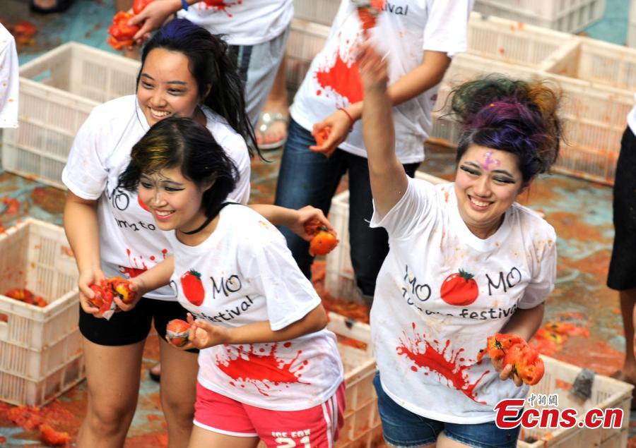 People have fun during a tomato fight in Shenyang city of northeast China's Liaoning province on Aug. 31, 2014. The fight attracted over 400 young persons from home and abroad. [Photo: China News Service / Yu Haiyang]