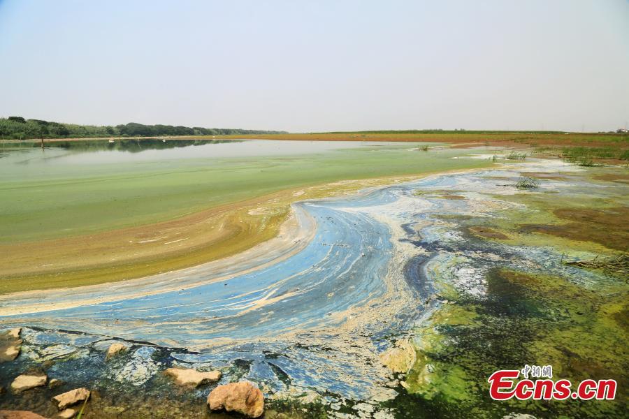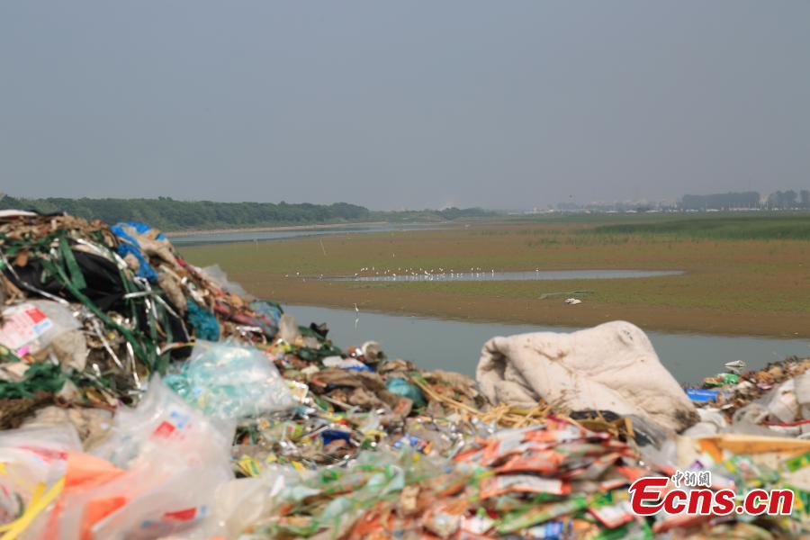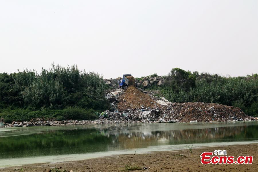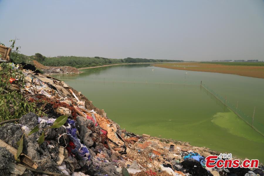 Garbage dump overturns water into stream of oil at a shoal of Hangzhou gulf, Yuyao city, East China's Zhejiang province, Aug 30, 2014. The place, used to be an attractive inhabitation for migrant birds migrating to and fro from East Asia to Australia, now is severely threatened by the polluted water. [Photo: China News Service / Zhang Mingming]
