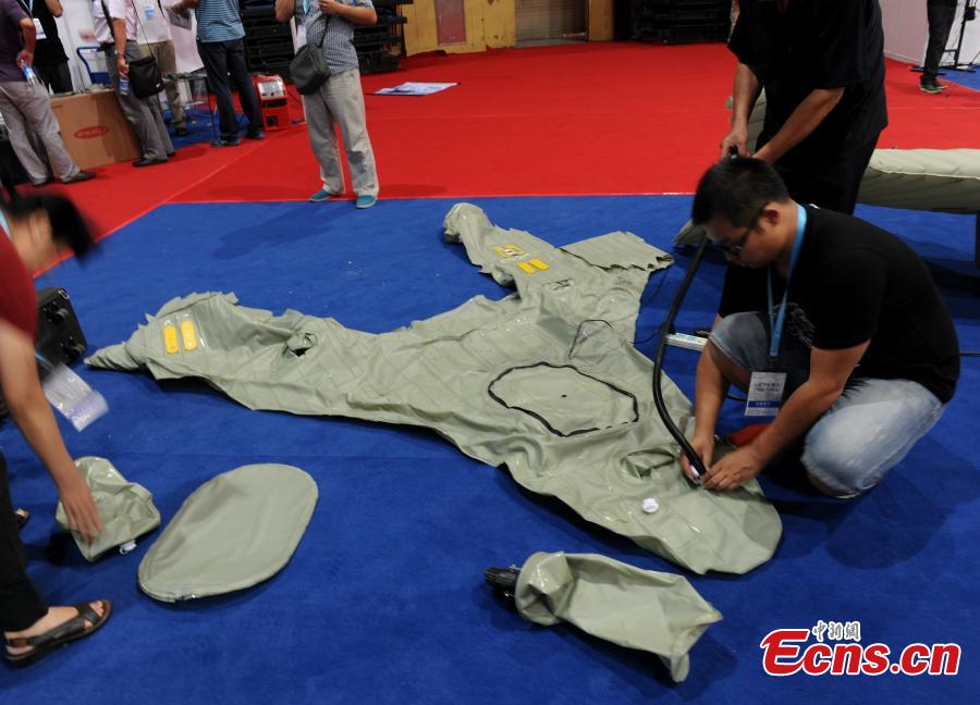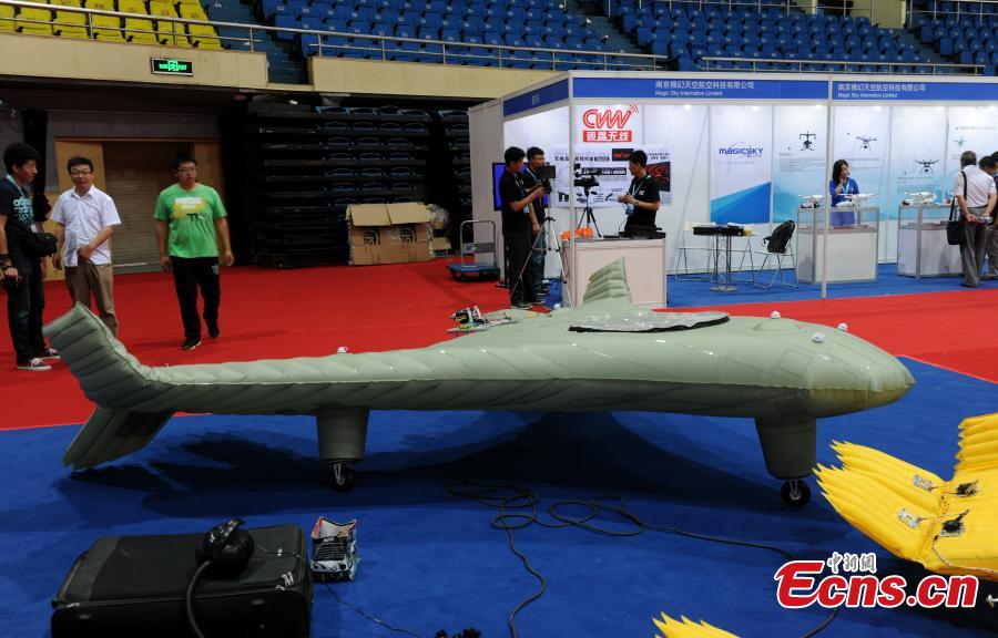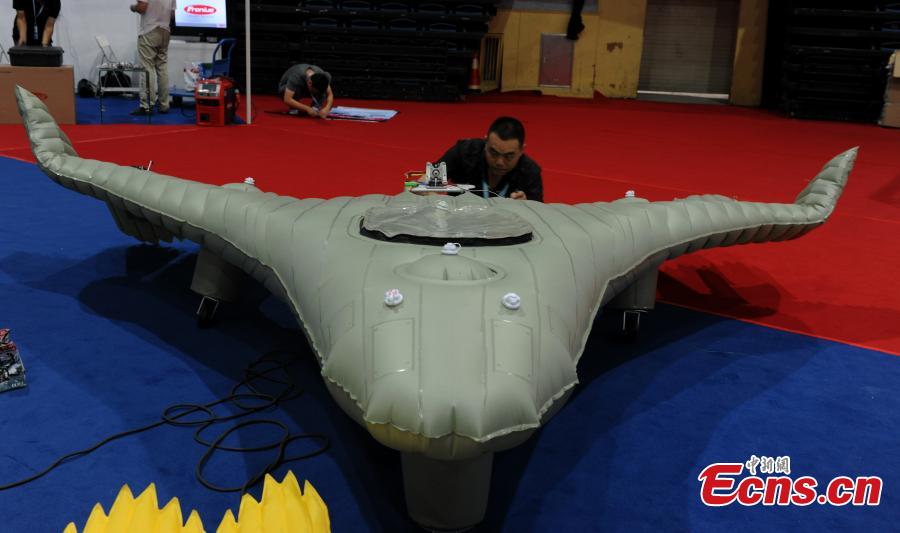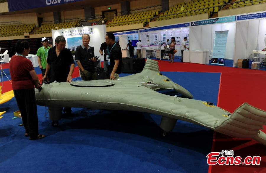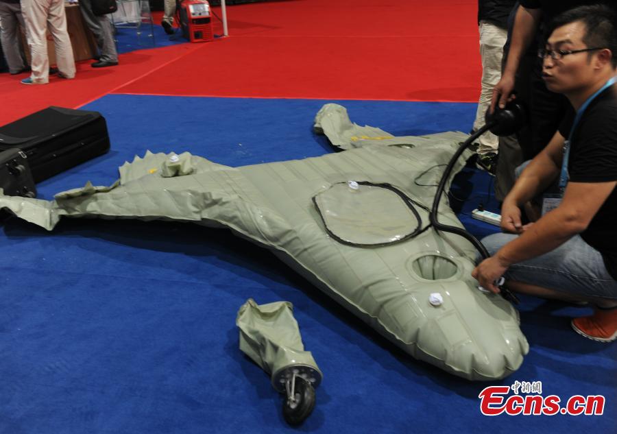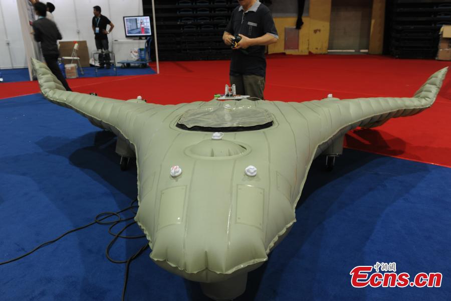 An advanced inflatable plane makes its debut at the 2014 Tianjin International UAV and Model Exhibition in Tianjin municipality on August 29, 2014. The plane was made mostly of soft composite material and could be folded and put into a suitcase. The plane, which could fly as high as 4,000 meters with a maximum load of 25 kilograms, would be used for air photography, air surveys and remote monitoring. [Photo: China News Service/ Chen Haifeng]