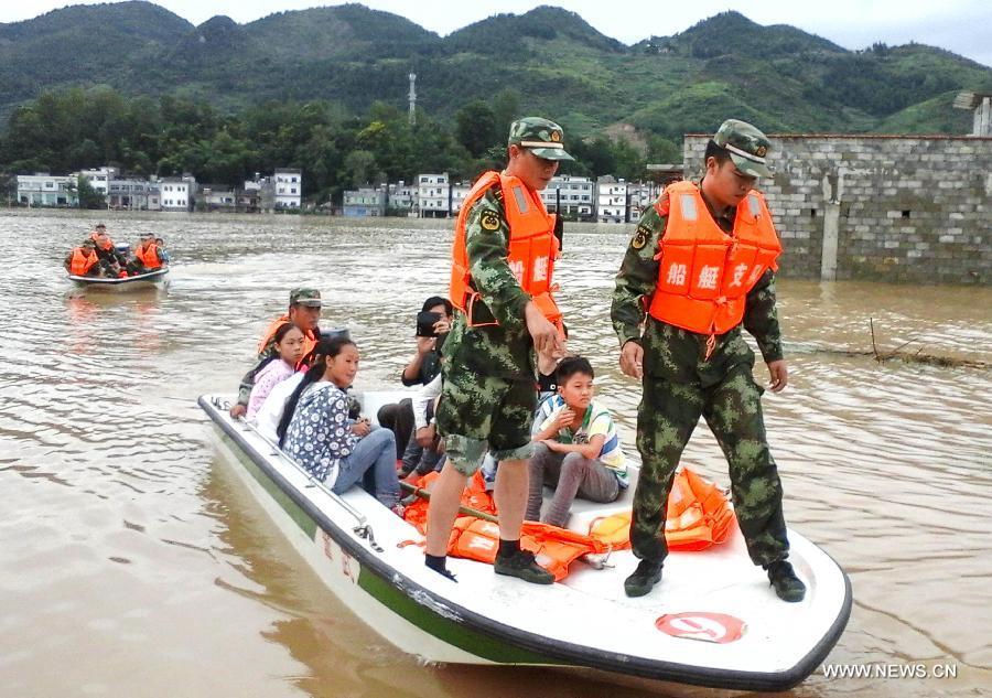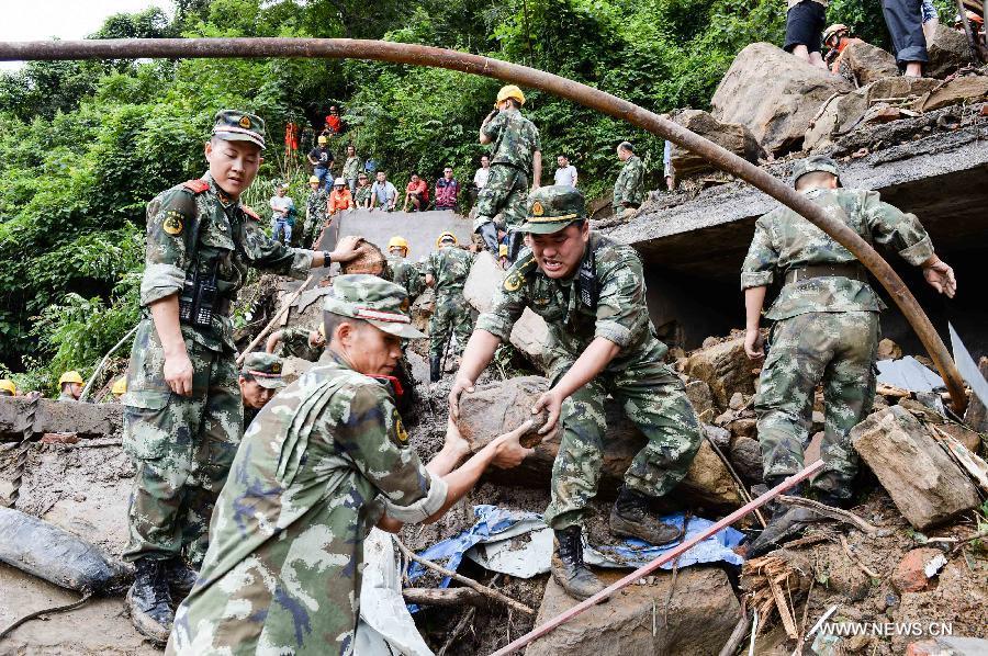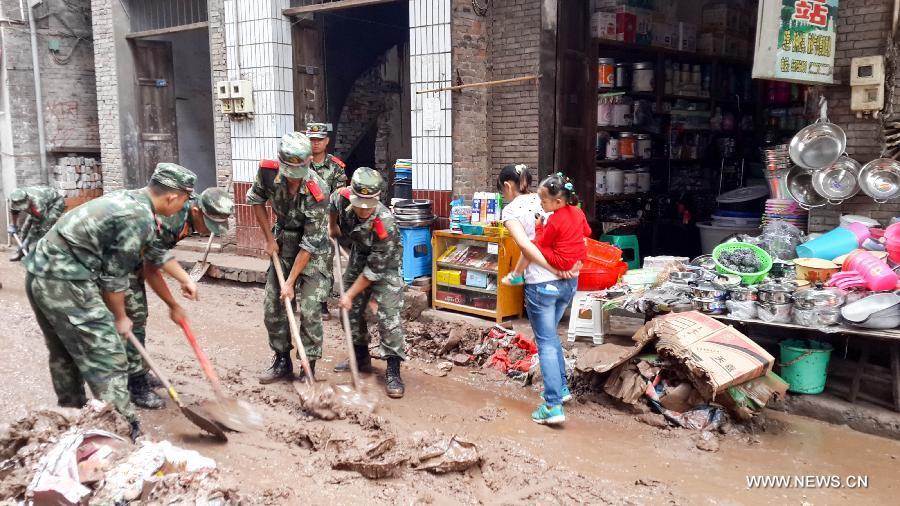 Soldiers help clean muds in Sangping Town of Yunyang County, southwest China's Chongqing Municipality, Sept. 2, 2014. Eleven people died and 27 others were missing as of 3 p.m. Tuesday after rainstorms brought landslides to Chongqing. A total of 1.09 million local residents in 9 counties and regions were affected. (Xinhua/Xie Jiang)