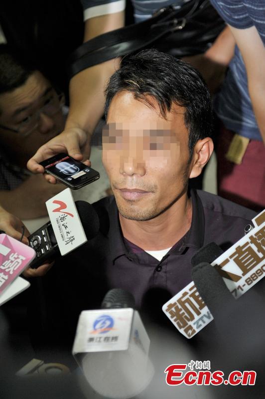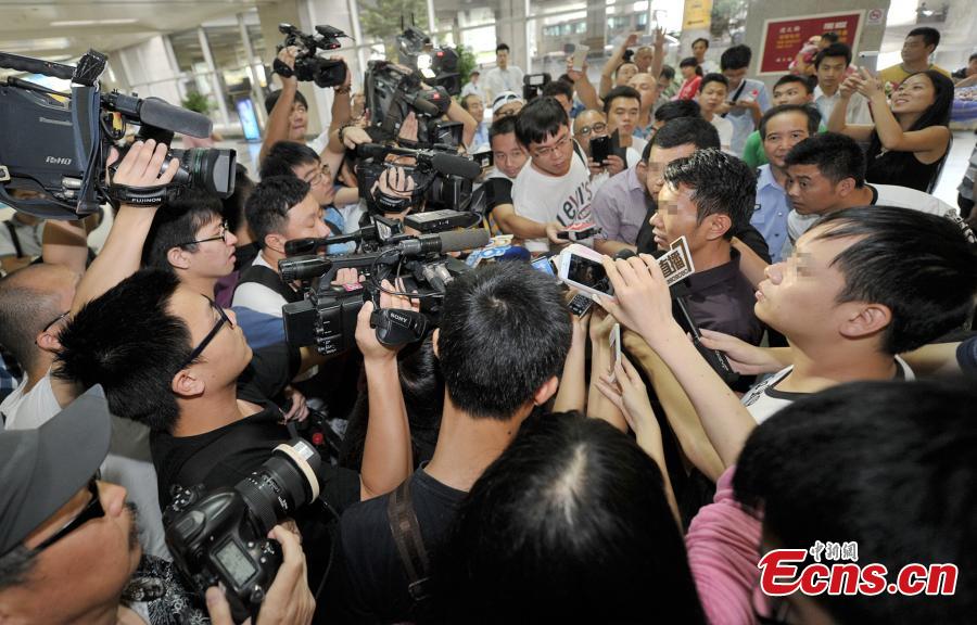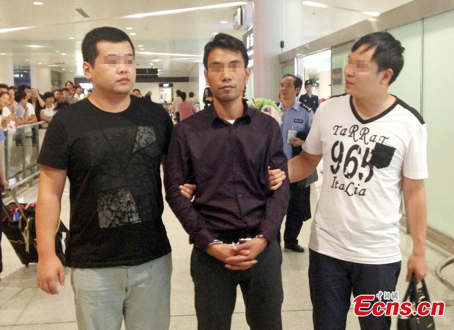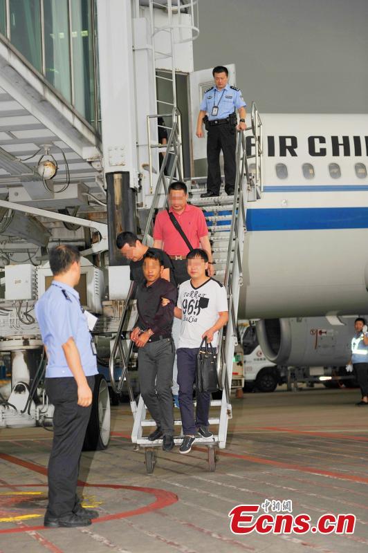 Wu (C), fugitive suspected of economic crimes, is escorted back to China from Columbia on Sept. 2, 2014. According to Zhejiang police, it is the first time that an economic fugitive is escorted back from a South American country after international cooperation. China's public security bureau launched in July this year an action codenamed "Fox Hunting 2014", which aimed at economic fugitives at large in foreign countries and regions. More than one month after its launch, a total of 11 economic fugitives were escorted back and two of them surrendered themselves. [Photo: China News Service / Li Chenyun]