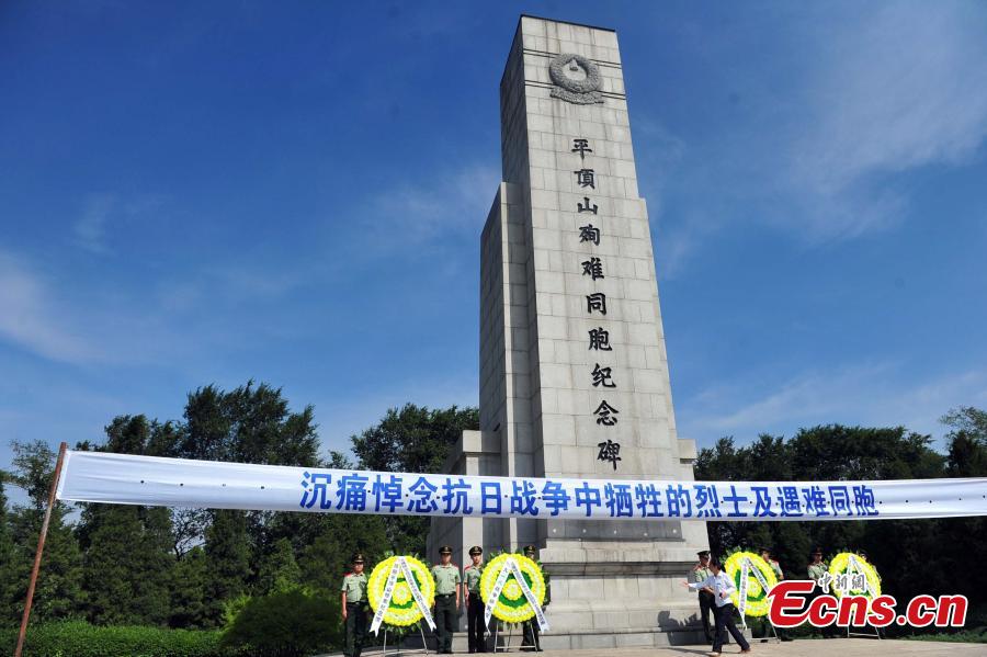 College students from University of South China mourn over martyrs and heroic groups of the Chinese People's War of Resistance against Japanese Aggression (1937-45) in front of a monument in Hengyang, Central China's Hunan province on September 2, 2014. The Japanese army in China formally surrendered to the Chinese government on September 3, 1945. The day was appointed the national commemoration day of victory over the Japanese invaders. [Photo: China News Service/ Cao Zhengping]
