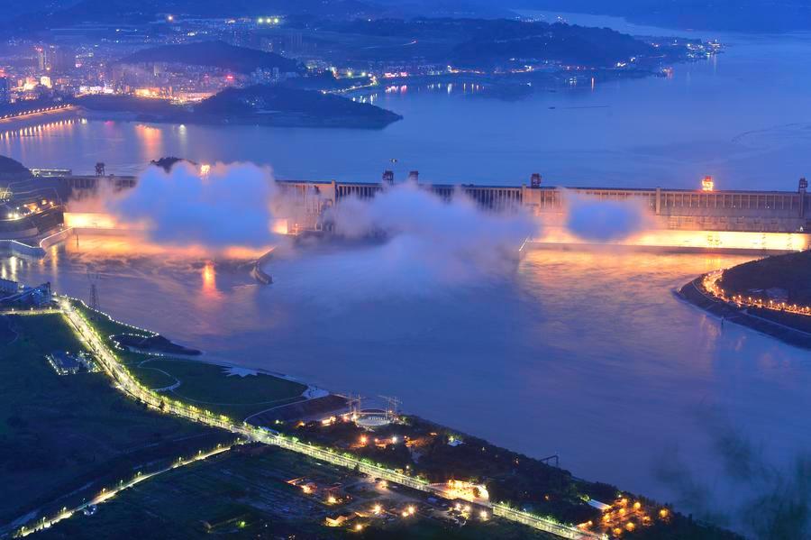 Flood water is discharged through the sluice gate of the Three Gorges Dam, Sept 3, 2014. Due to continuous rainfalls upstream, the reservoir saw its biggest flood peak this year on Sept 2 leading to the discharge. [Photo/Xinhua]