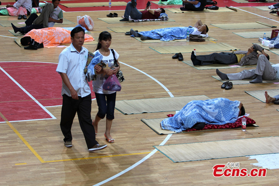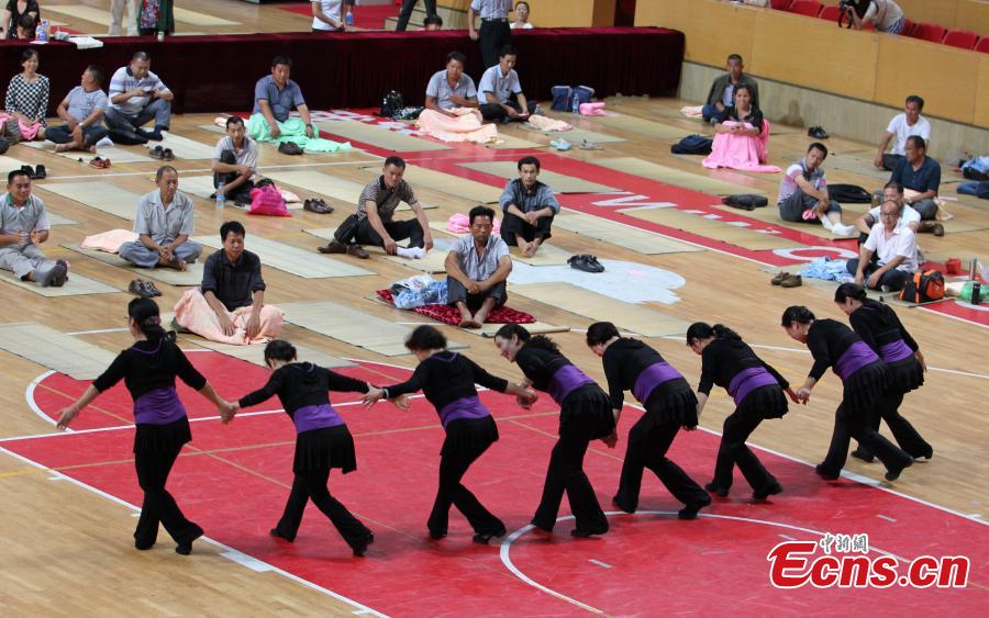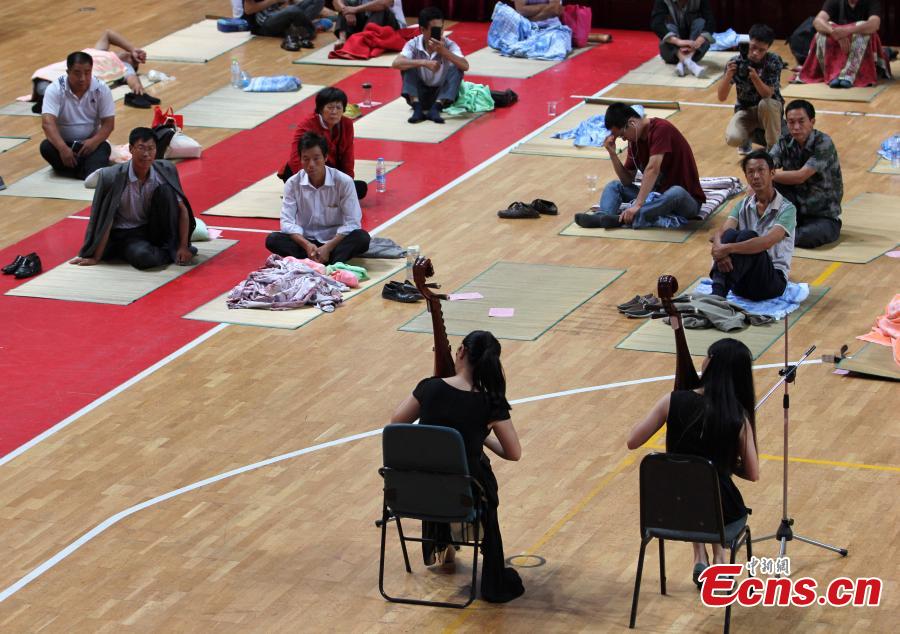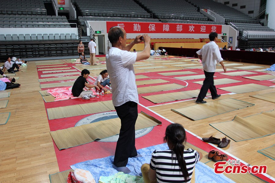 Parents of newly arrived freshmen students sit and watch performance by Logistic staff of Central China Normal University in Youming Gymnasium in Wuhan, Hubei province on September 3, 2014. For nine consecutive years, the university opened its gym overnight to parents who escorted their newly enrolled children to the campus. Besides that, it also offered blankets, hot tea and performance to parents. [Photo: China News Service / Sun Xinming]