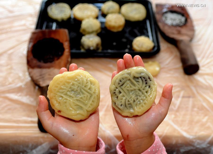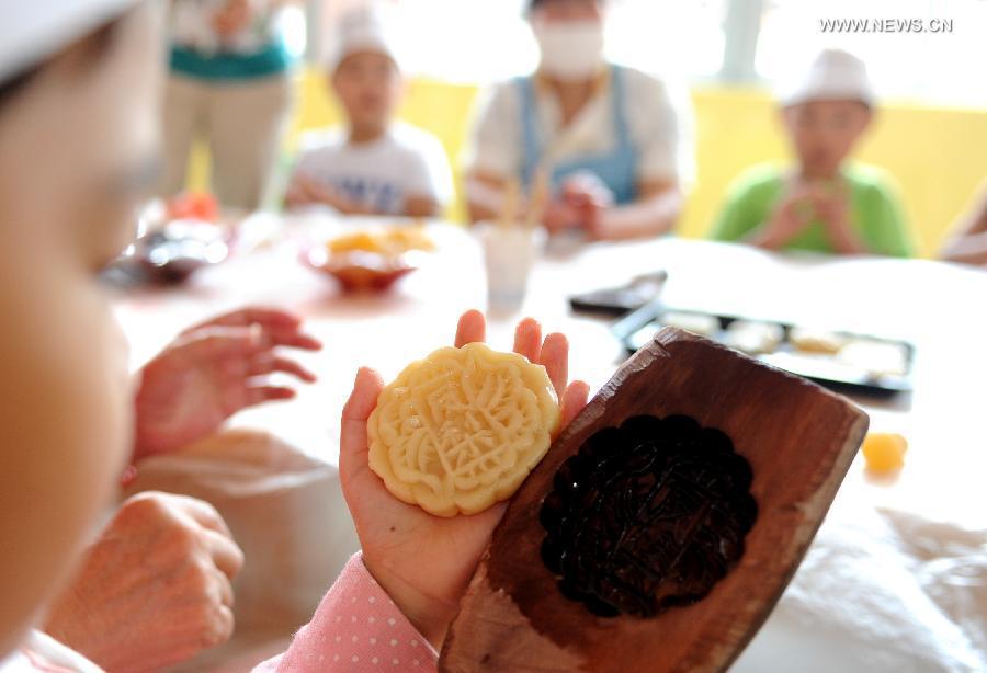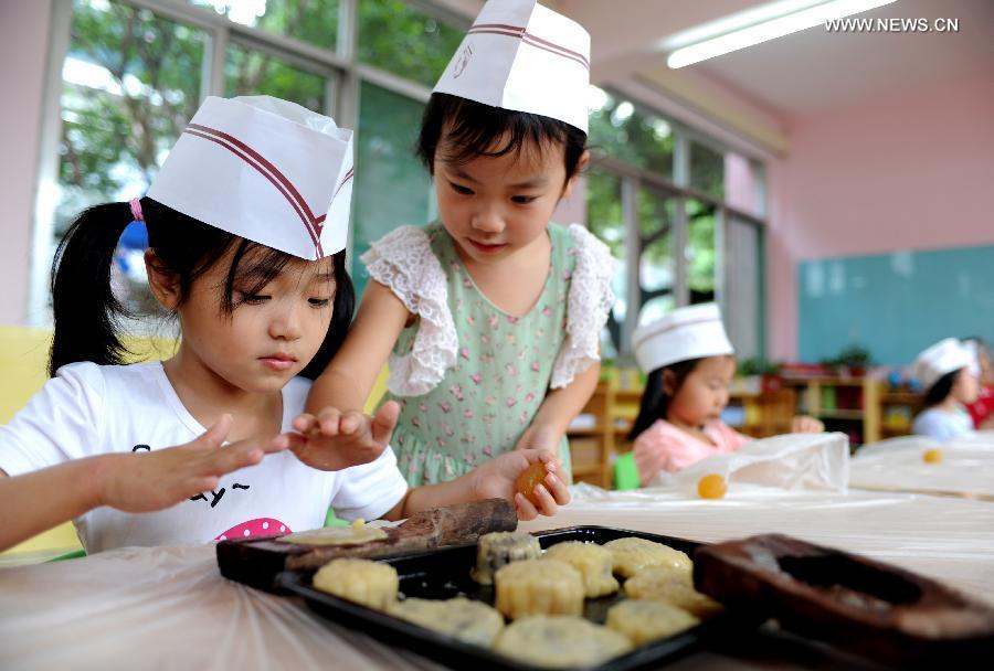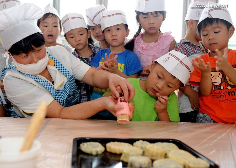 Children learn to make mooncakes under the guidance of a baker in Hefei, capital of east China's Anhui province, Sept 4, 2014. The Mid-Autumn Festival, which falls on Sept 8 this year, is a traditional Chinese festival for family reunions, during which folks will enjoy the full moon together and eat mooncakes - small round pies with a variety of fillings. (Xinhua/Liu Junxi)