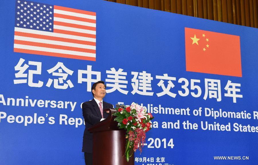 Chinese Vice President Li Yuanchao delivers a speech at a reception held to mark the 35th anniversary of the establishment of China-US diplomatic relations in Beijing, China, Sept 4, 2014. (Xinhua/Ma Zhancheng)
