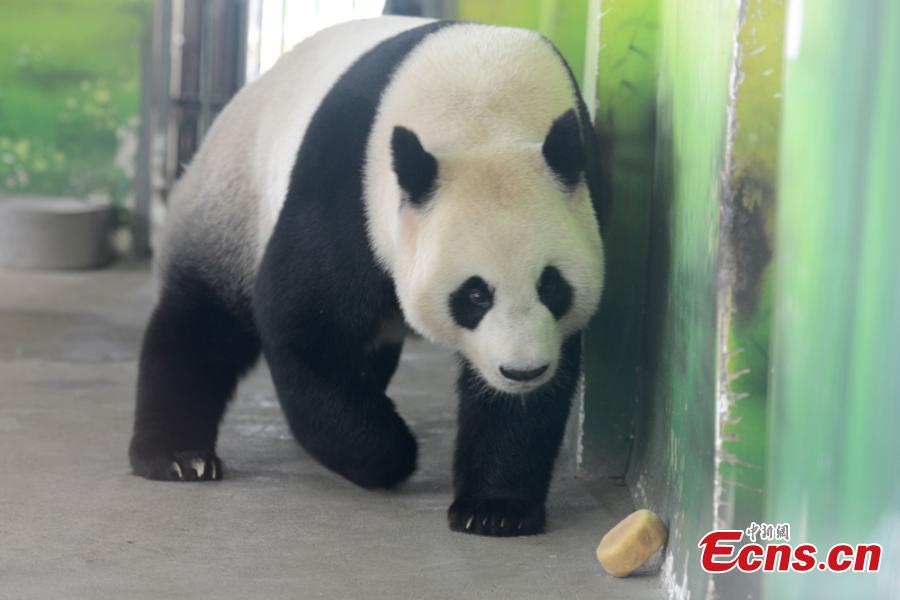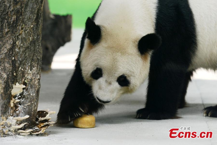 Giant pandas "Xinyue" and "Zhuyun" are enjoying the specially made moon cakes at the Taihu Lake National Wetland Park in Suzhou, east China's Jiangsu province, Sept 7, 2014. [Photo: Wang Sizhe/chinanews.com]