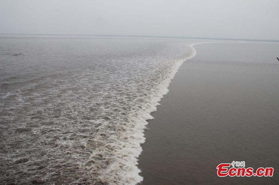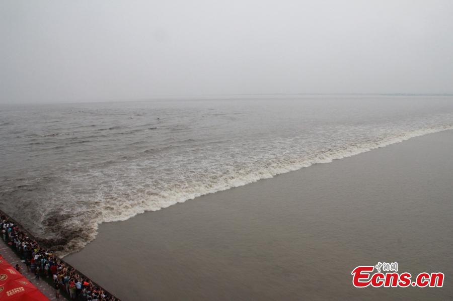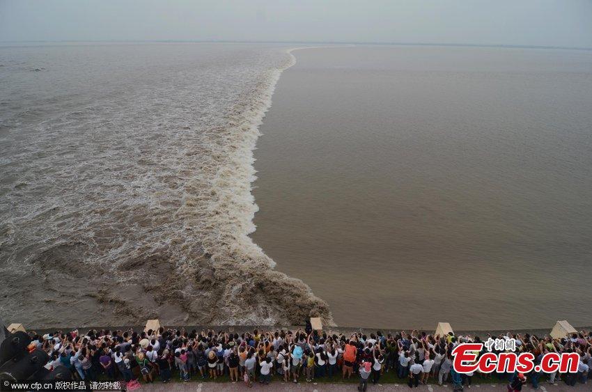 The Qiantang River tide is shown along the Haitang levee, Yanguan town, Haining city on Monday. The event attracted more than 167,000 tourists who came to observe the river's tide during the three-day Mid-Autumn Festival holiday from Sept 6-8. [Photo: China News Service/ Hu Jiaqi]