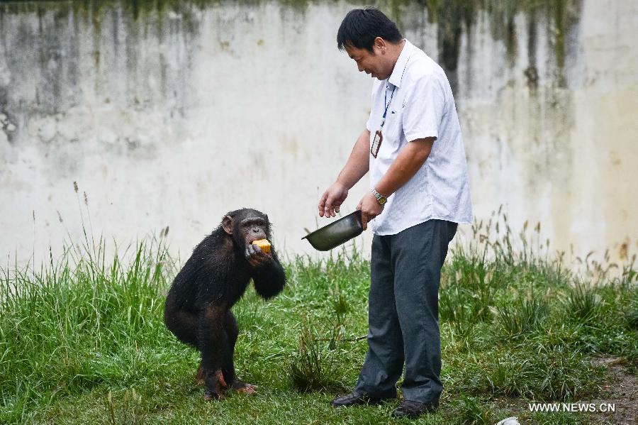 Ring-tailed lemurs come to eat "moon cakes" in the wild animal zoo of Hefei, capital of east China's Anhui Province, Sept. 8, 2014. Chinese have the tradition of eating moon cakes during the Mid-Autumn Festival which falls on Monday this year. Feeders in the zoo also made moon cakes for animals according to their daily diets and tastes. (Xinhua/Zhang Duan)