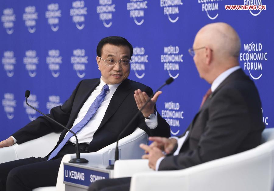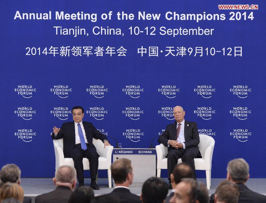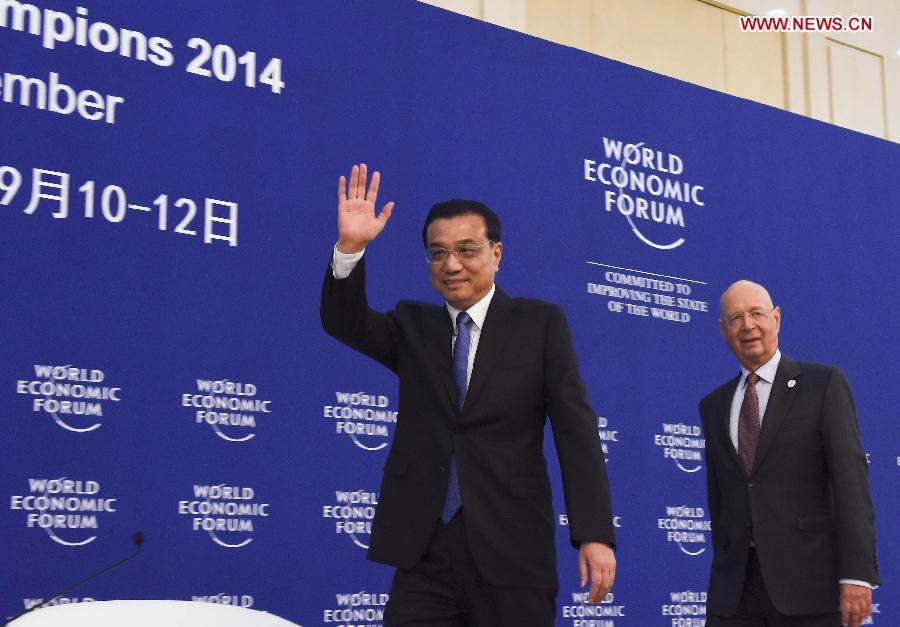 Chinese Premier Li Keqiang (L) and Klaus Schwab, founder and executive chairman of the World Economic Forum (WEF), walk into the conference hall of a meeting ahead of the Summer Davos forum in Tianjing Municipality, north China, Sept 9, 2014. (Xinhua/Li Xueren)