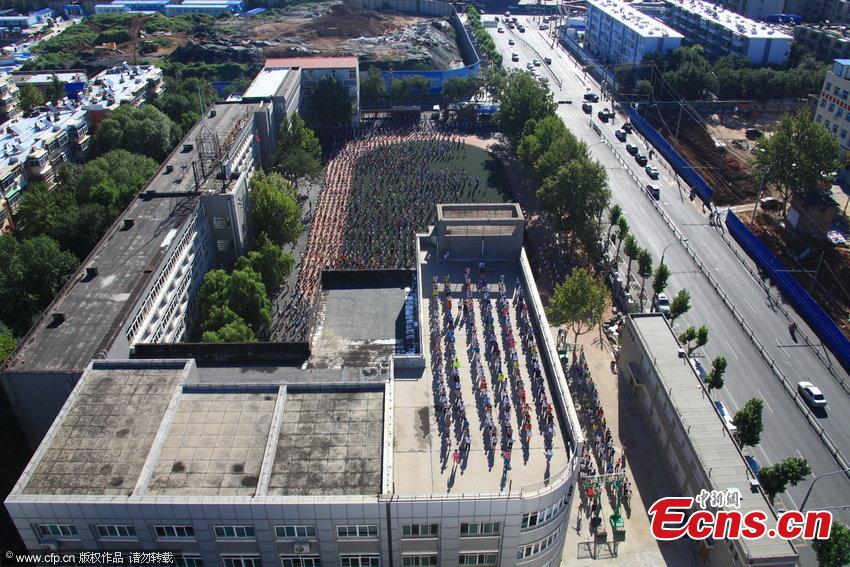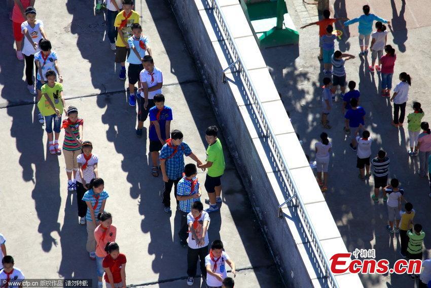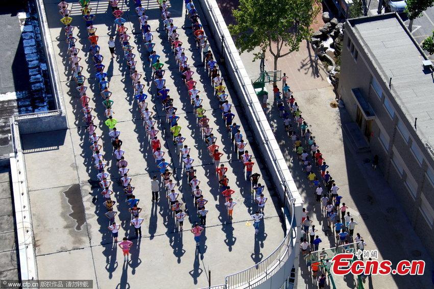 A total of 150 students do exercise on a building roof in Dianliu No 1 Primary School in Jinan, Shandong province on September 5, 2014. Since only a small part of students were arranged to do exercise on the roof, concerns have been aroused among parents who doubted the school’s resources couldn’t meet demands of its students. Yang Xingyong, president of the school explained that the rooftop sports ground installed with fences was only used when students do exercise, and they were not allowed to carry out free activities on the roof. [Photo/ CFP]