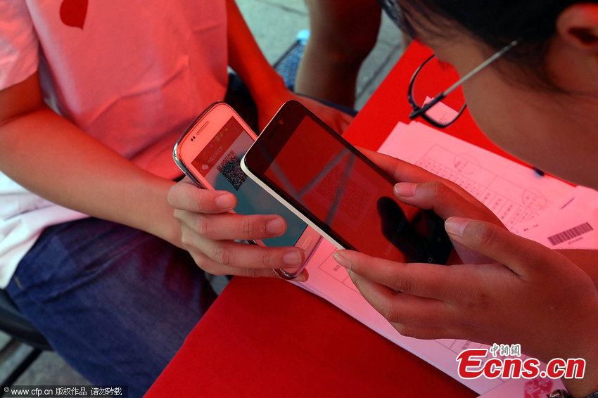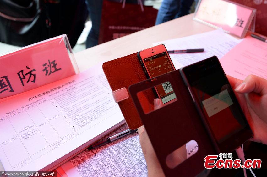 A teacher of Renmin University of China shows to a freshman the digital orientation services on a mobile phone at a registration desk on September 9, 2014 in Beijing. With an app, the university’s freshmen don't need to print out registration forms and they could also get information on campus life through the university’s WeChat public account. [Photo: CFP]