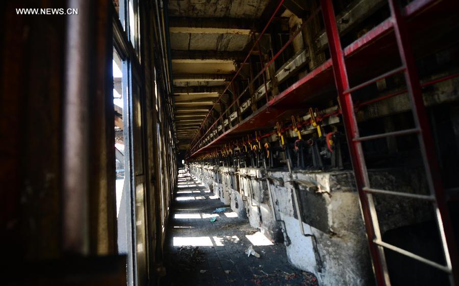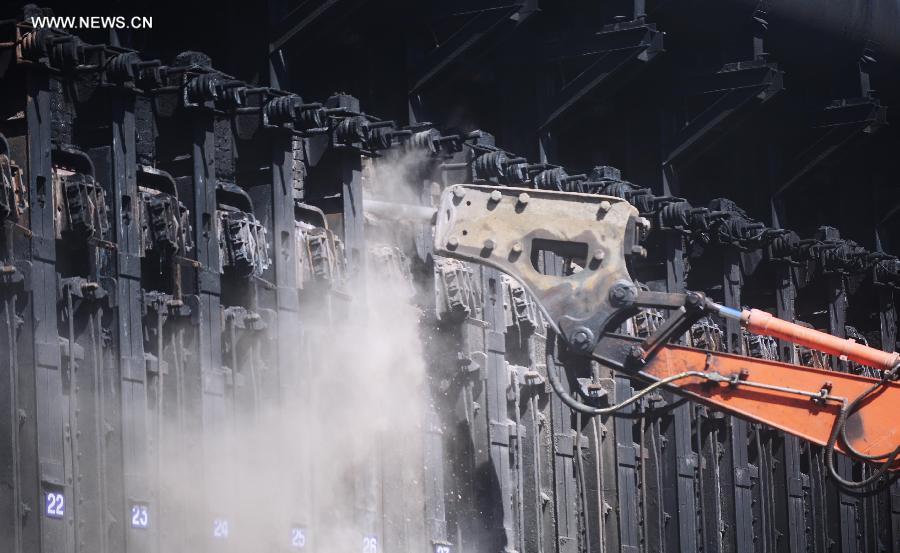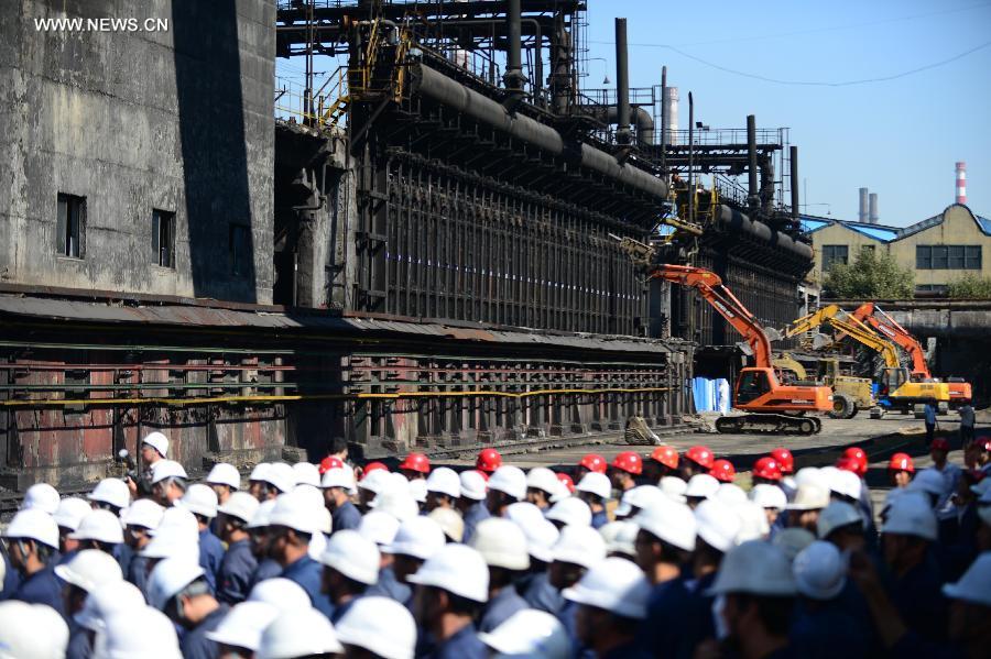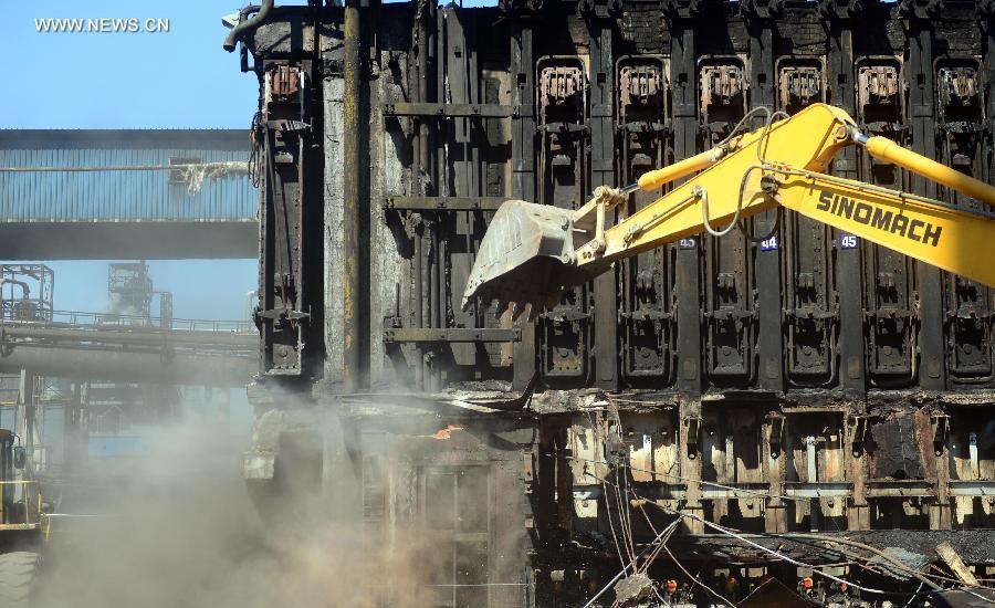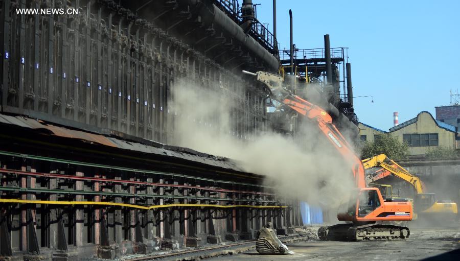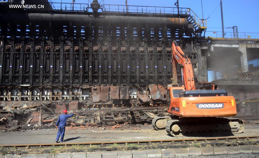 Engineering vehicles dismantle pollutive coke furnaces at Anshan Iron & Steel Group in Anshan, northeast China's Liaoning province, Sept 10, 2014. Anshan Iron & Steel Group, China's second-largest steel maker, tore down six fuel-inefficient coke furnaces on Wednesday in response to the "blue sky project", an emission-reduction campaign in Liaoning province aimed at improving air quality. (Xinhua/Yang Qing)