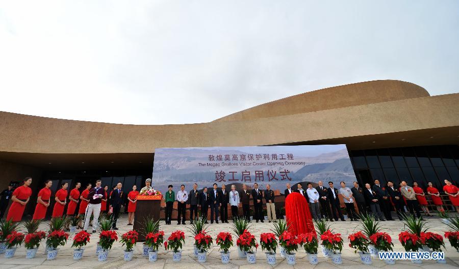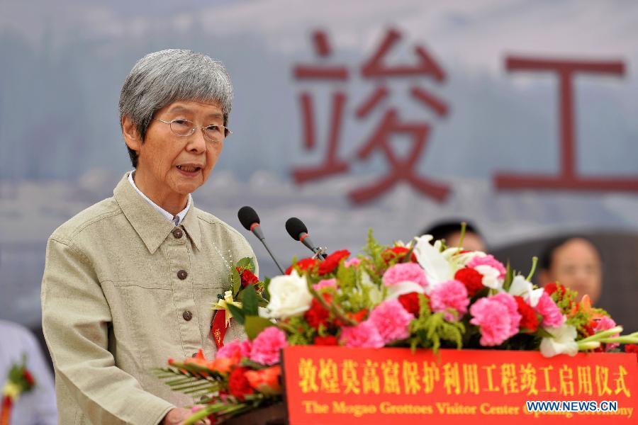 Fan Jinshi, head of the Dunhuang Academy and a leading Mogao Grottoes scholar, addresses the inauguration of the Mogao Grottoes' visitor center in Dunhuang, northwest China's Gansu province, Sept 10, 2014. The largest-ever preservation project at Dunhuang's Mogao Grottoes, a collection of ancient Buddhist cave artworks, has been completed with the official opening of an affiliated visitor center on Wednesday. Occupying the caves on a 1,700-meter-long cliff, the Mogao Grottoes has some of the world's finest Buddhist frescoes and sculptures, which were made as early as 1,600 years ago. It was listed as a UNESCO World Heritage Site in 1987. Since late 2008, a series of preservation efforts have taken place at the Mogao Grottoes, including cave consolidations, redesigned tourist footways, security and sandstorm-protective facilities, as well as the newly-opened visitor center, which shows digital images of the caves. Starting from Sept. 11, visitors are required to undergo an online reservation process in order to visit the Mogao Grottoes. (Xinhua/Chen Bin)
