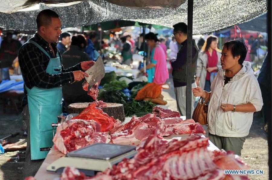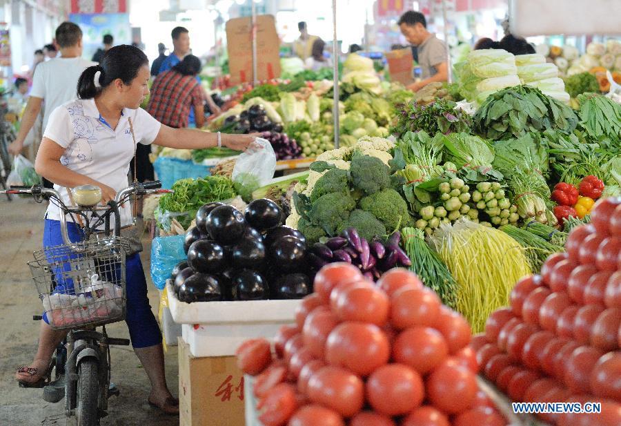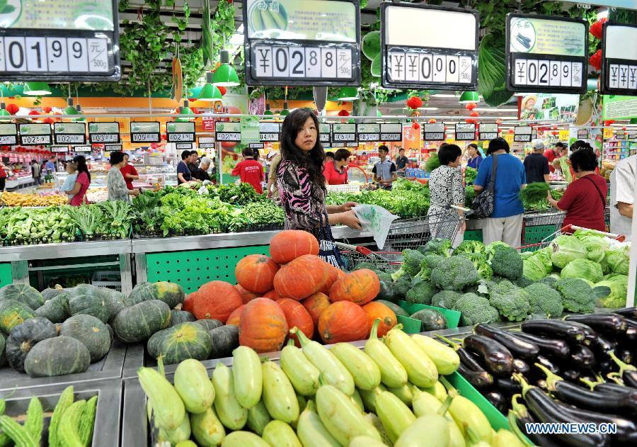 Customers purhcase goods at a food exhibition in Zhengzhou, capital of central China's Henan Province, Aug. 7, 2014. China's consumer price index, a main gauge of inflation, grew 2 percent year on year in August, the National Bureau of Statistics said Thursday. The August CPI growth rate was lower than the 2.3 percent seen in July. (Xinhua/Li Bo)