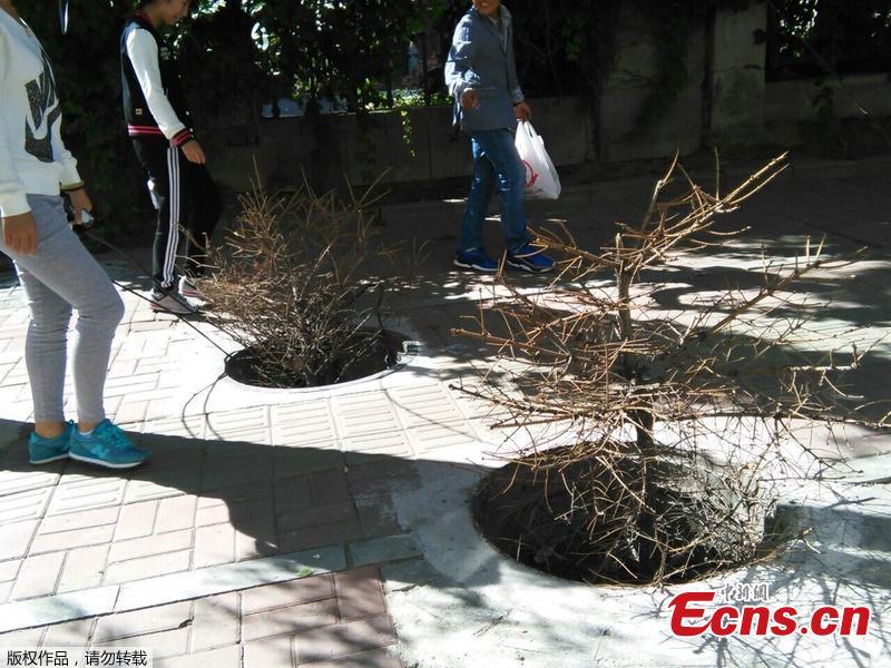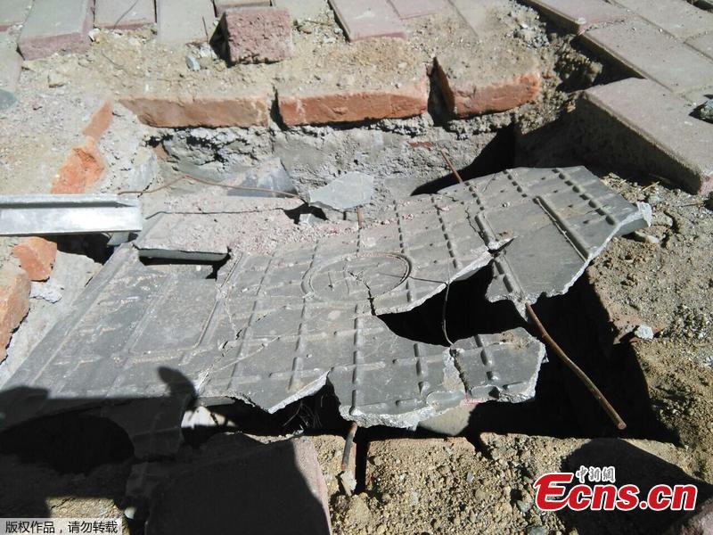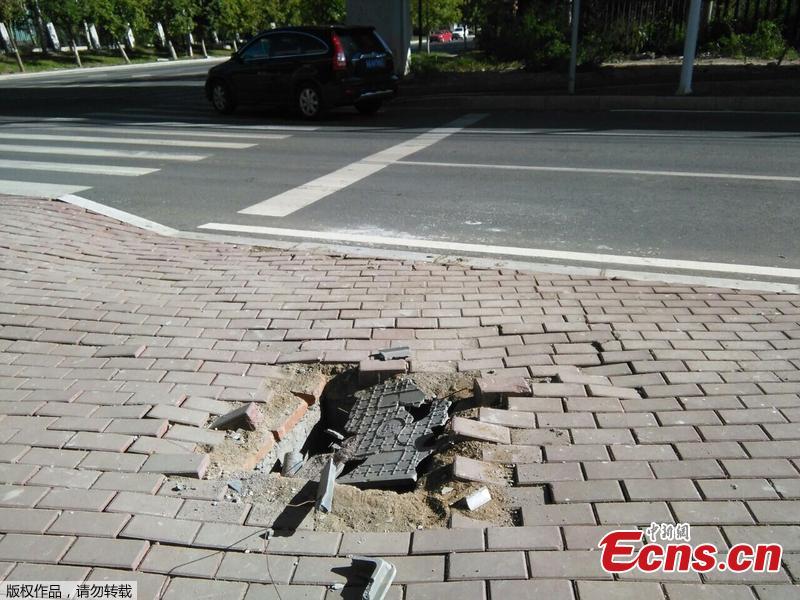 A paper-thin manhole cover is seen used along a street in Changchun, Northeast China’s Jilin province on September 9, 2014. Reinforced by twigs from beneath, the lid was already damaged, making the street a non-pedestrian friendly area. [Photo/ IC]