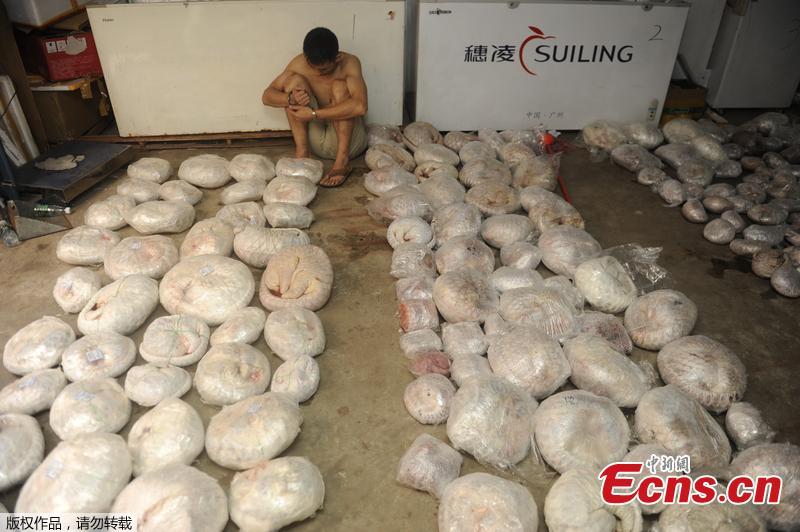 Forest public security officers seize a total of 457 smuggled dead pangolins in a residential community in Baiyun district of Guangzhou, Guangdong province on September 11, 2014. Pangolins, which are under second-class state protection in China, are often smuggled because their meat is considered a delicacy and their scales are believed to have medical qualities. [Photo/ IC]