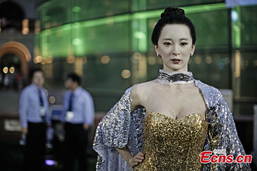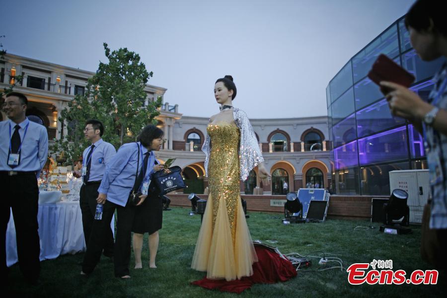 A robotic “beauty” is on show at a cultural event held for guests of 2014 Tianjin Summer Davos Forum at Minyuan Stadium in Tianjin municipality on Thursday night, September 11, 2014. [Photo: China News Service/ Tong Yu]