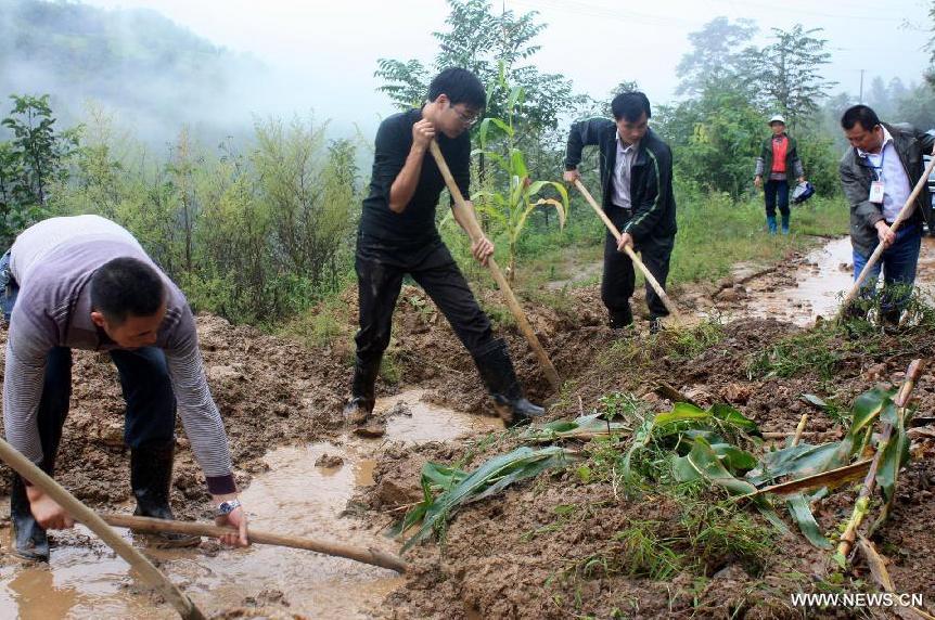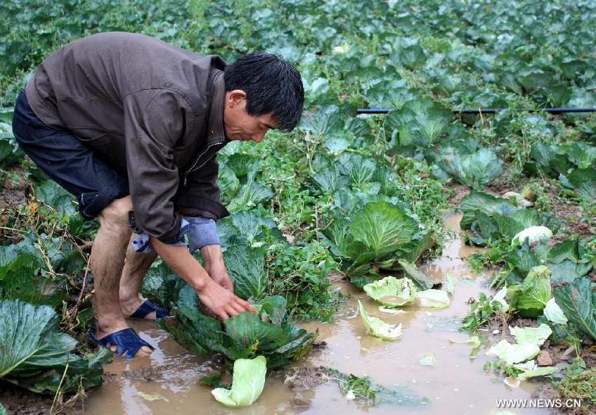 A vegetable field is flooded in Guankouba Village, Ningqiang County of Hanzhong, northwest China's Shaanxi Province, Sept. 11, 2014. Lingering rainstorms have hit Shaanxi since Sept. 6, causing three people dead and one missing. As of 8:00 a.m. on Sept. 12, a total of 575,000 people in the province were affected by the downpour. (Xinhua/Li Dehua)