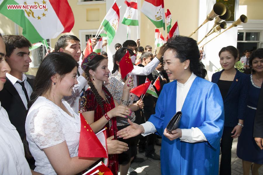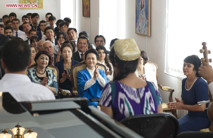 Chinese President Xi Jinping's wife Peng Liyuan talks with teachers and students at Tajikistan state college of music arts in Dushanbe, capital of Tajikistan, Sept. 12, 2014. (Xinhua/Huang Jingwen)