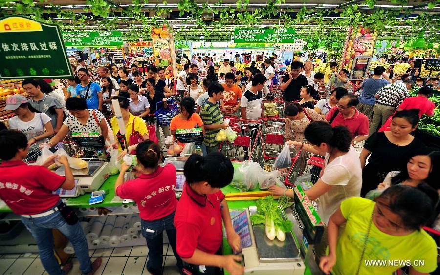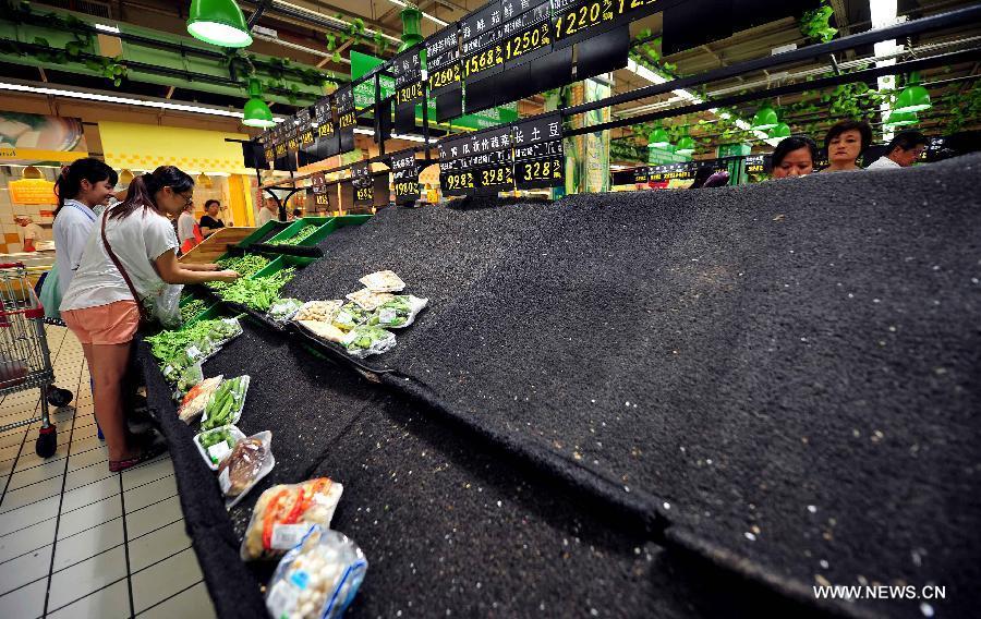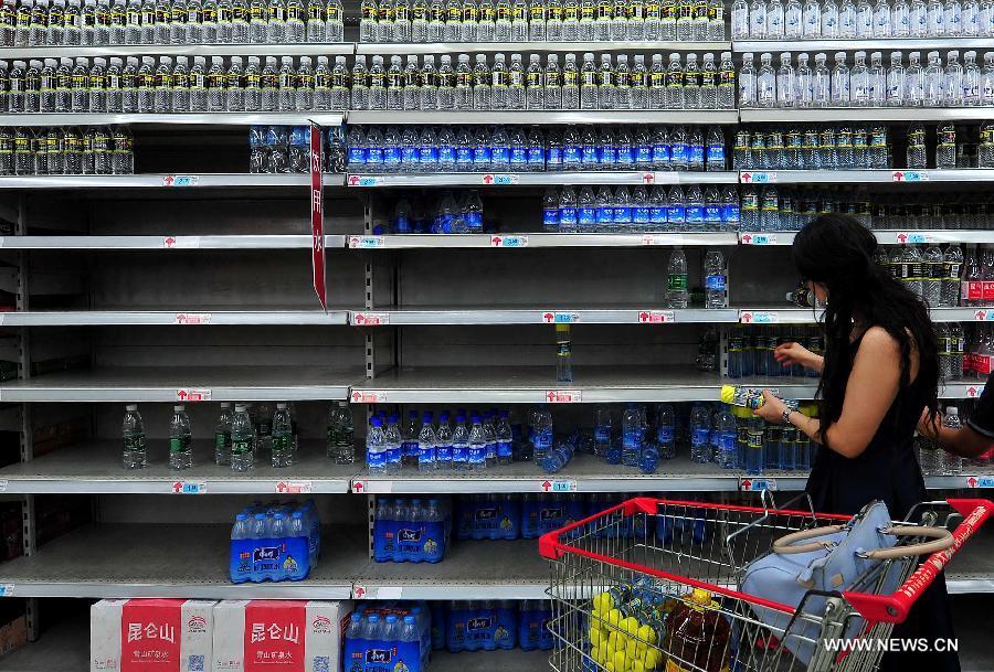 The shelf for vegetable is almost empty in a supermarket in Haikou, capital of south China's island of Hainan province, Sept 15, 2014. The Hainan government issued the highest Grade I alert at 10 am Monday against typhoon Kalmaegi, which was spotted on the sea 645 km southeast of Leizhou City, Guangdong province at 4 pm Monday. People in Hainan flocked into supermarkets to store up food and water. (Xinhua/Guo Cheng)