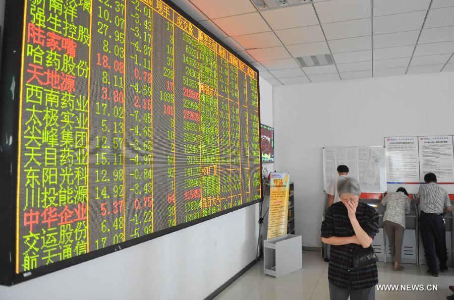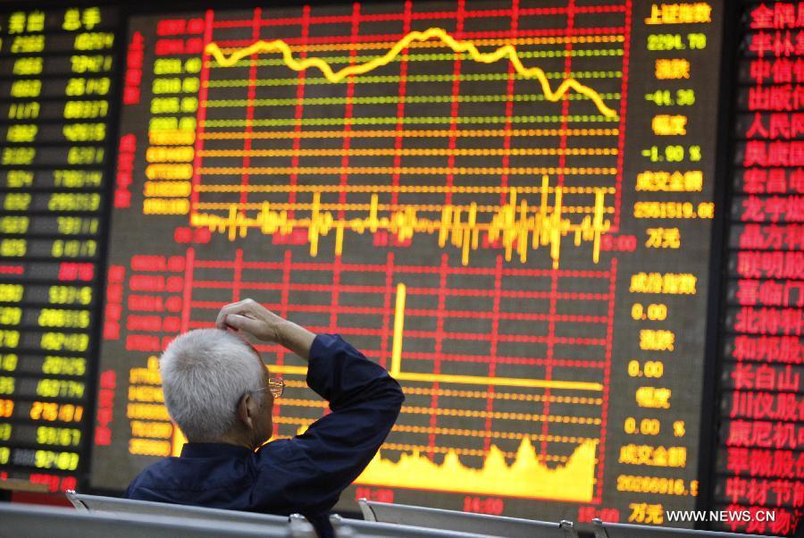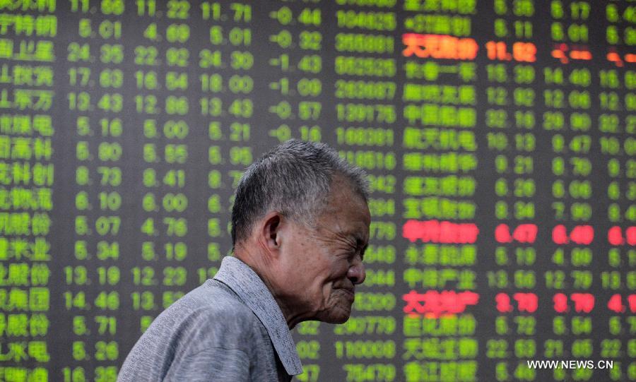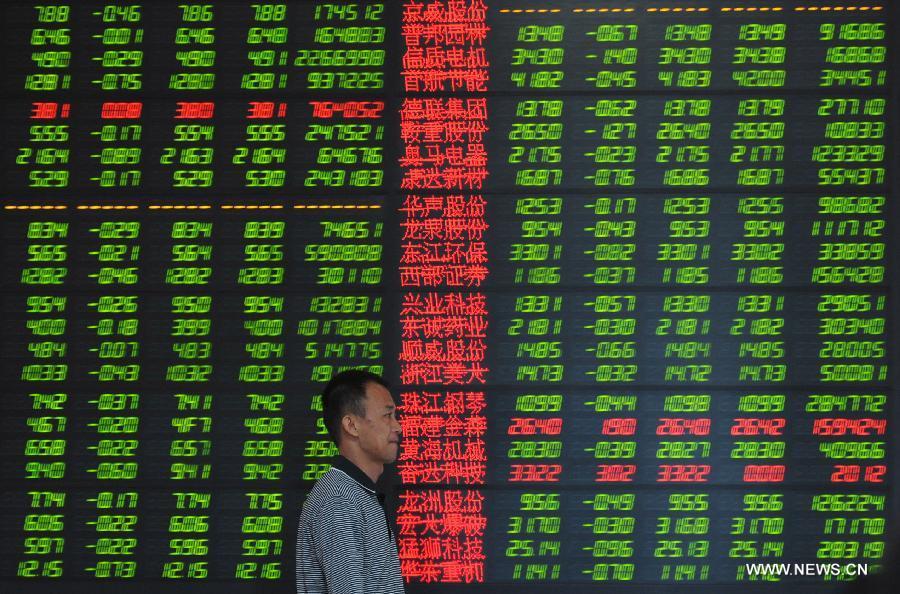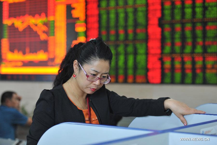 An investor reads stock information at a trading hall of a securities firm in Fuyang City, east China's Anhui province, Sept 16, 2014. Chinese shares closed lower on Tuesday, with the benchmark Shanghai Composite Index down 1.82 percent to finish at 2,296.55 points, owing to the plunge of growth enterprises. The smaller Shenzhen Component Index lost 191.57 points, or 2.36 percent, to close at 7,921.07 points. (Xinhua/Lu Qijian)