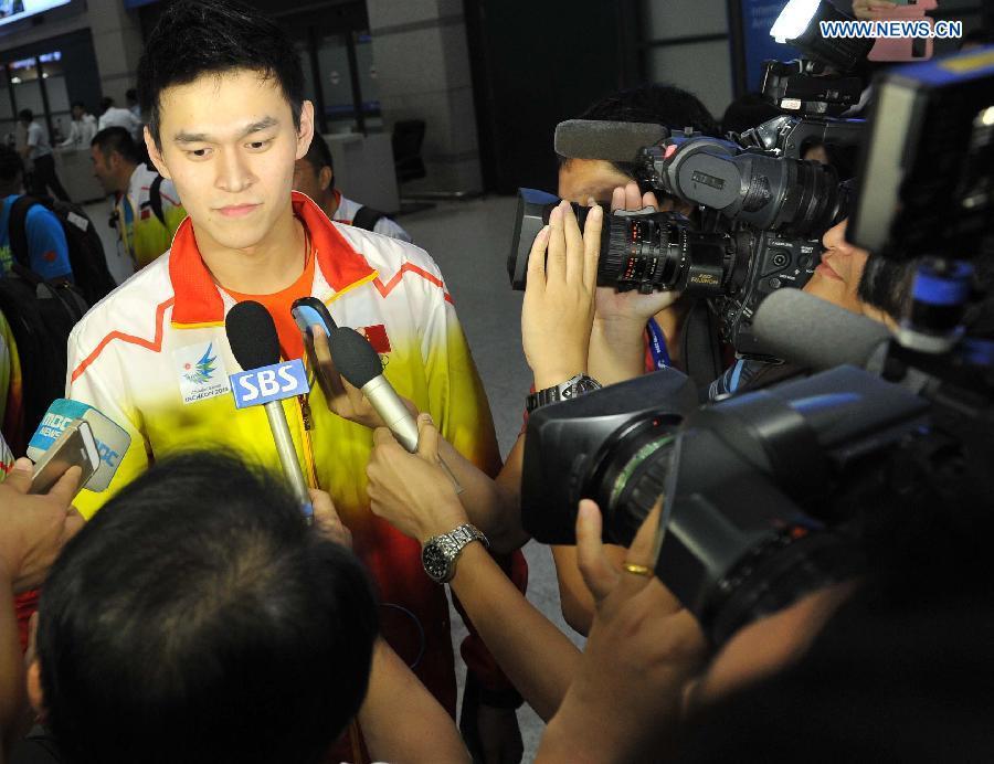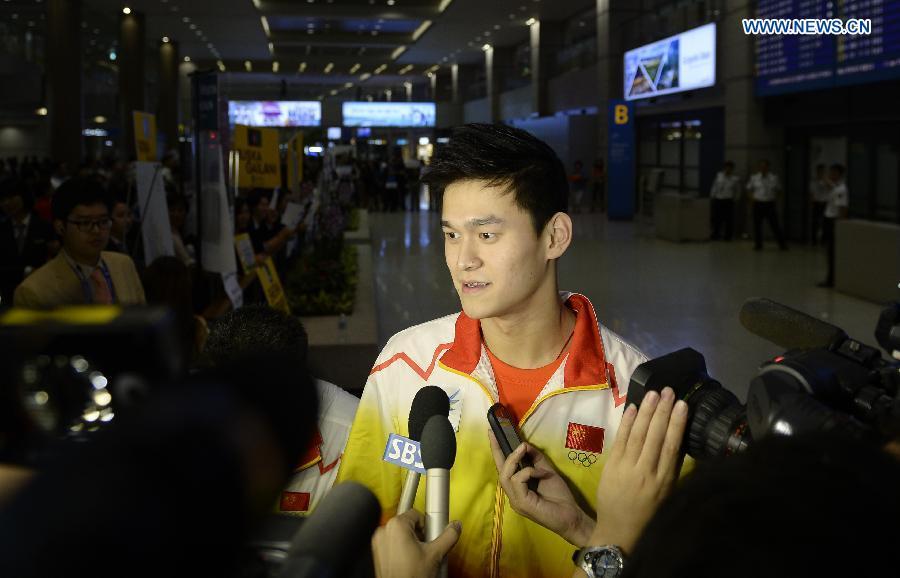 Chinese swimming athlete Sun Yang receives an interview at the international airport in Incheon, South Korea, Sept 16, 2014. Some members of the Chinese Sports Delegation arrived in Incheon on Tuesday afternoon to attend the 17th Asian Games. (Xinhua/Gong Lei)