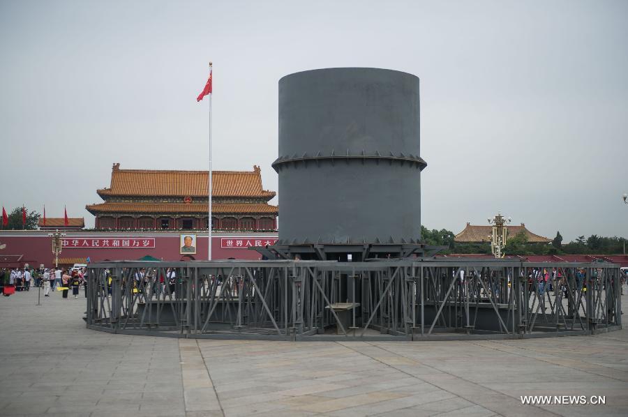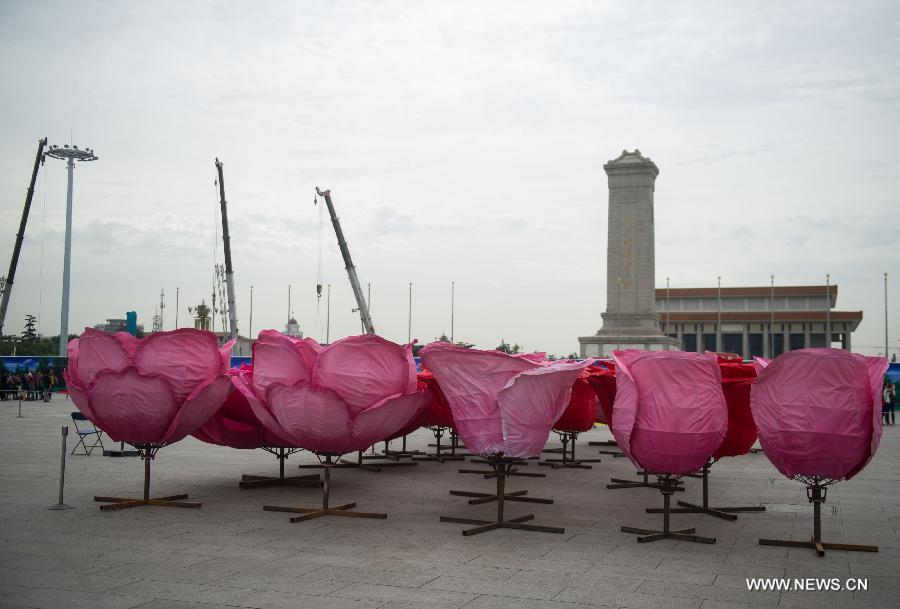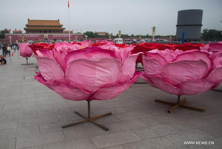 Flower decorations are prepared to greet the upcoming National Day on Oct. 1 at the Tian'anmen Square in Beijing, capital of China, Sept. 16, 2014. (Xinhua/Luo Xiaoguang)
