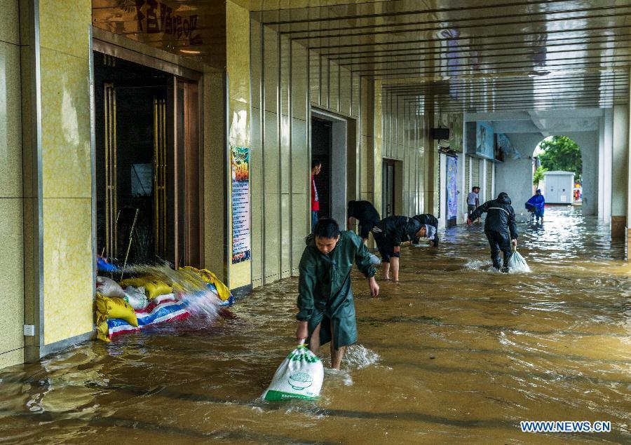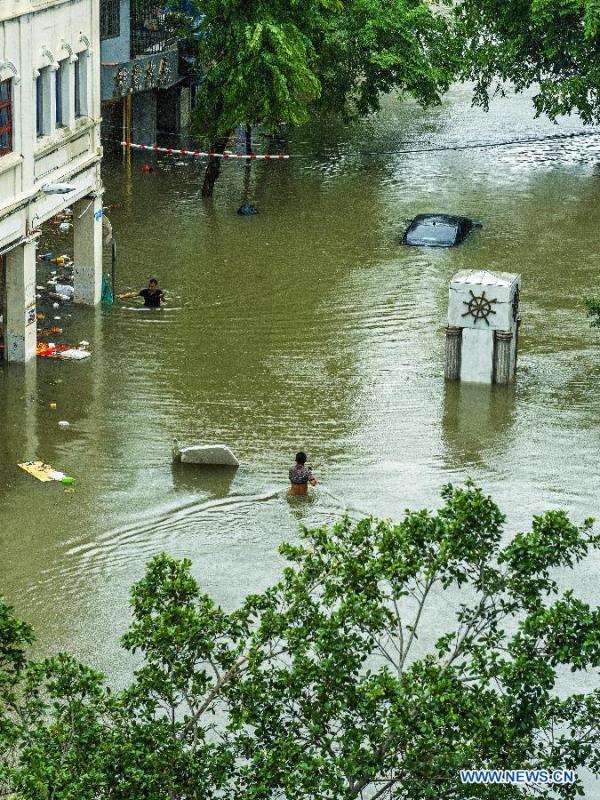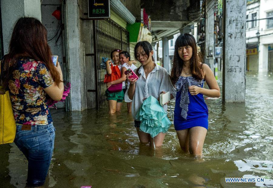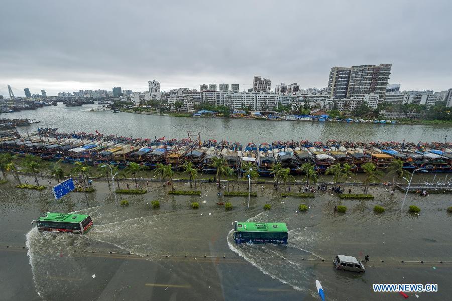 Buses move on flooded road in typhoon-hit Haikou, capital of south China's Hainan Province, Sept. 16, 2014. Seawater flew backward into the city as typhoon Kalmaegi landed in the island province on Tuesday morning. (Xinhua/Jiang Jurong)