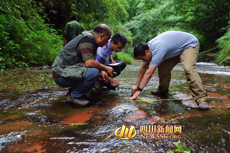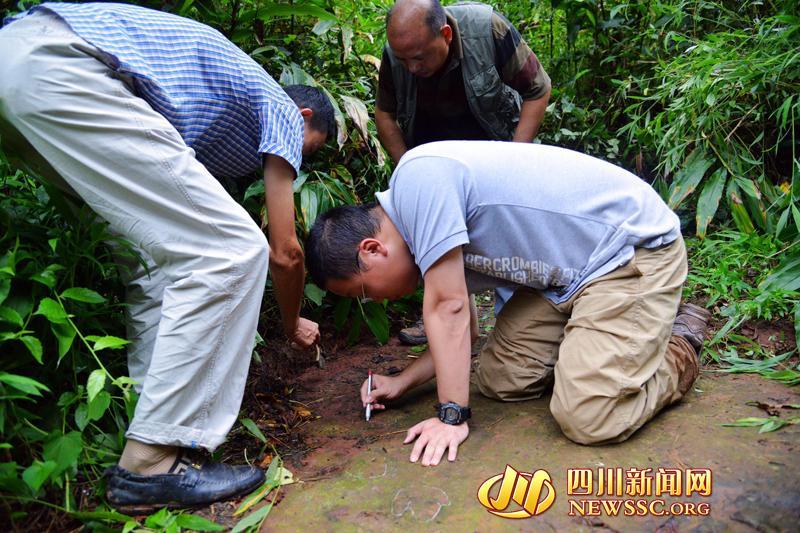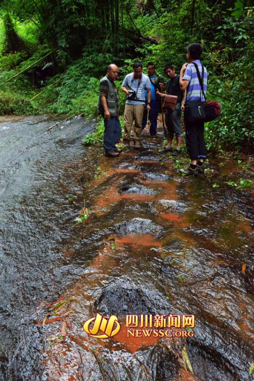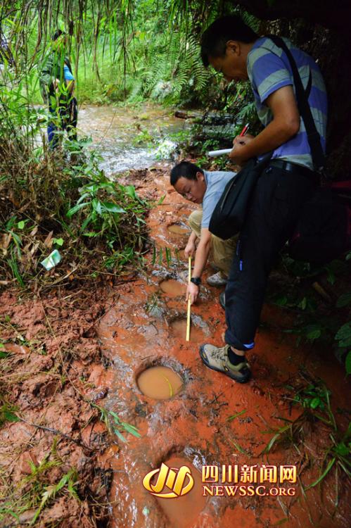 Experts make on-the-spot investigation over a dinosaur footprint cluster found in Xuyong county of Luzhou, Sichuan province on Monday, September 15, 2014. Scientists from Zigong Dinosaur Museum and China University of Geosciences confirmed that those footprints were from sauropod dinosaurs, theropod dinosaurs, and bird-footed dinosaurs that lived in the Cretaceous Period, about 100 million years ago. [Photo/ newssc.org]