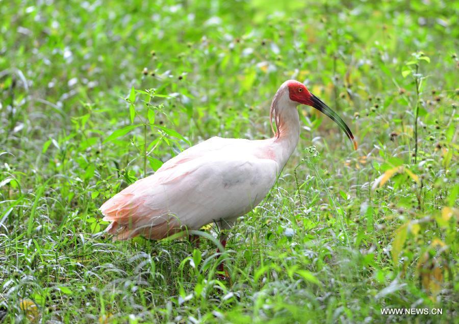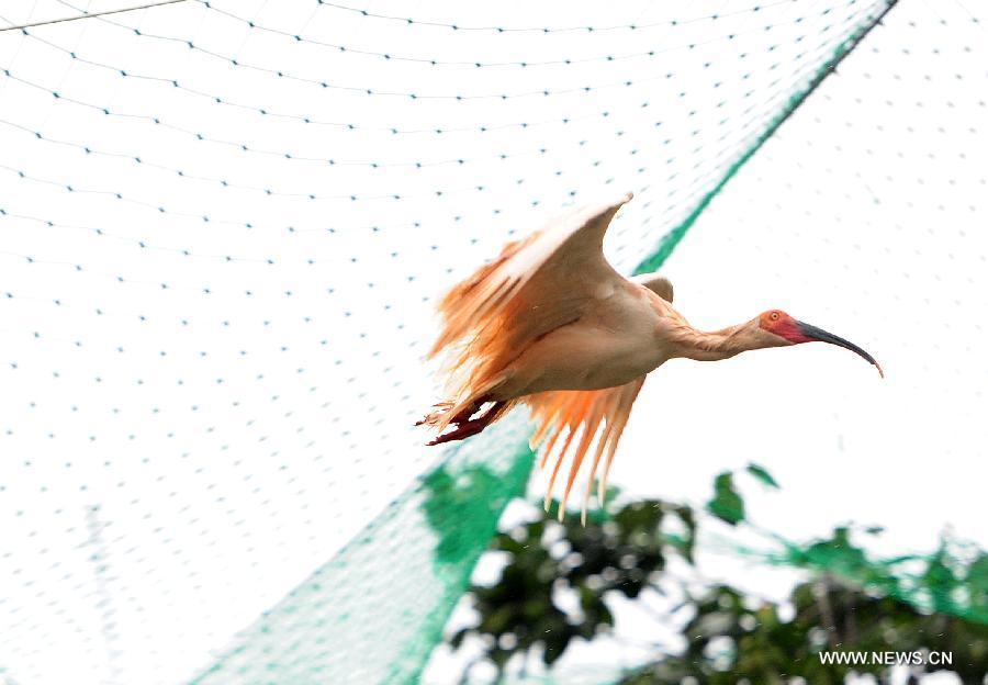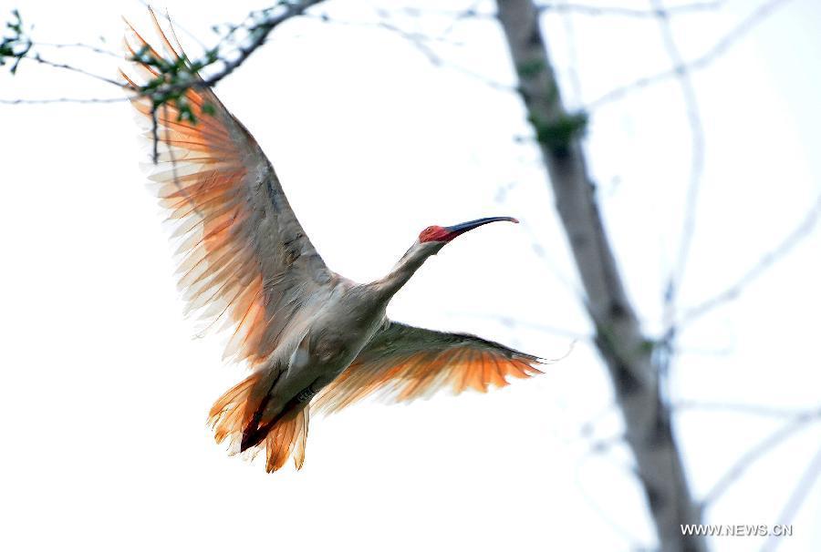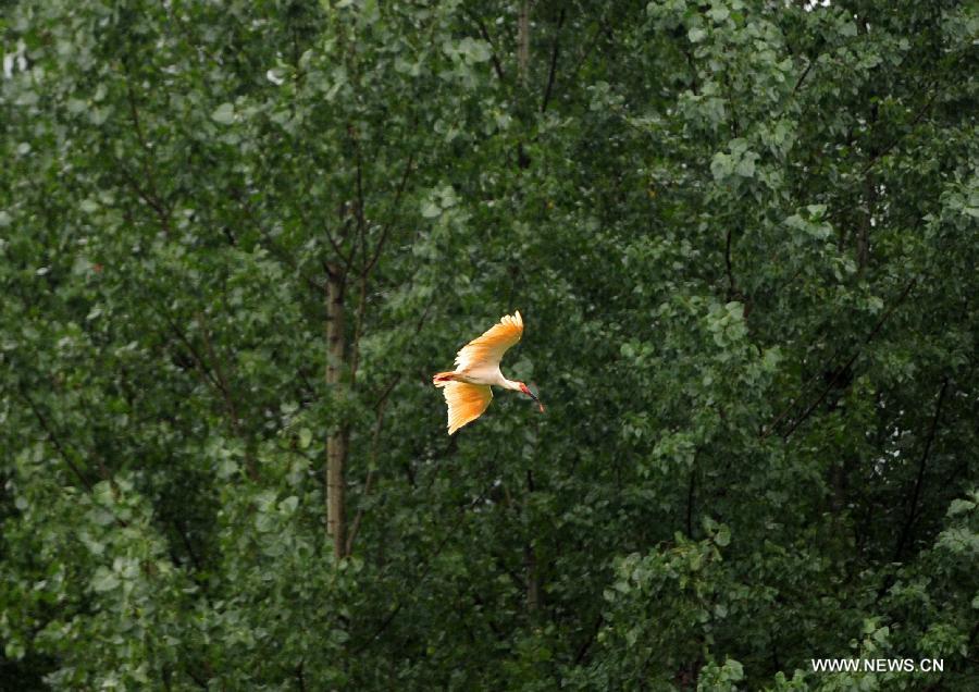 A crested ibis flies during a release activity in Baoji, northwest China's Shaanxi Province, Sept. 17, 2014. A total of 30 artificially-bred crested ibis were released to the wild here on Wednesday. The number of crested ibis in Shaanxi province has rose from 7 in 1981 to more than 2,000 by now, and the wild crested ibis' number has reached nearly 1,000. (Xinhua/Ding Haitao)