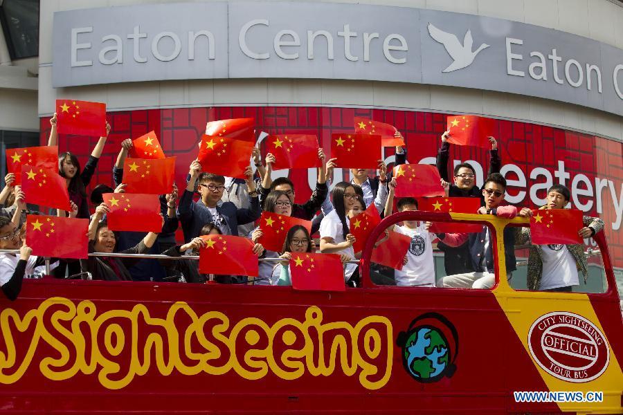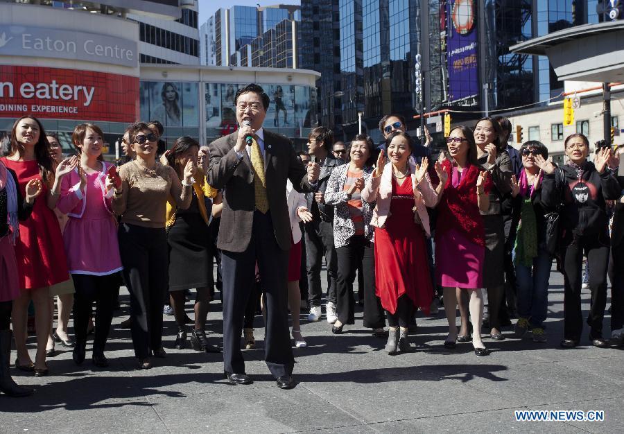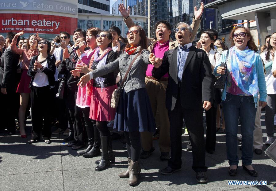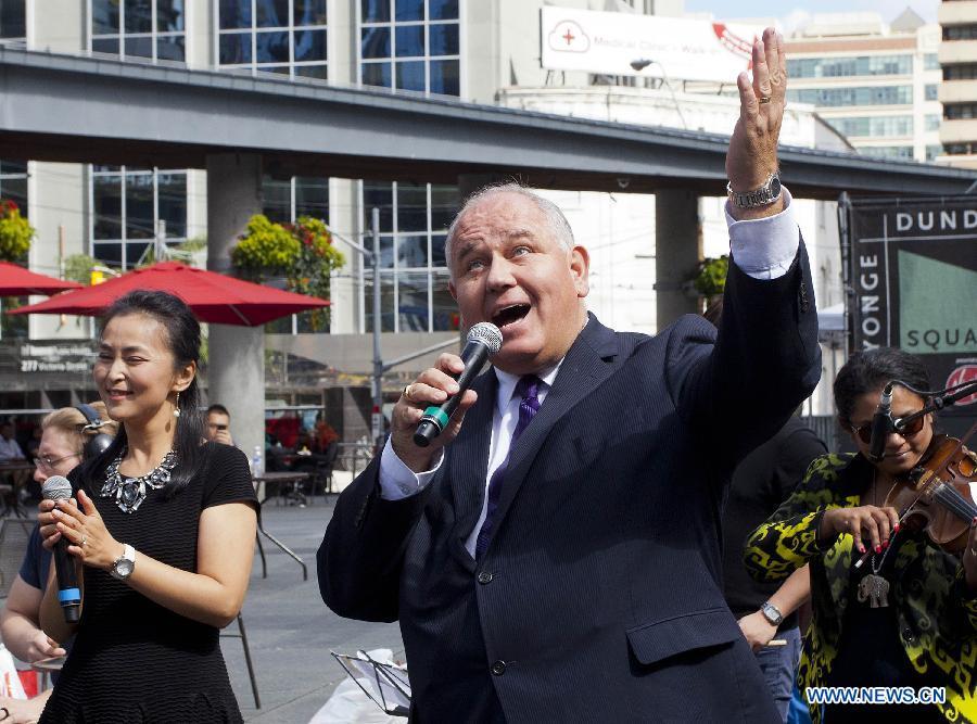 Frank Scarpitti (C), mayor of the city of Markham, Greater Toronto Area, sings a Chinese song during a performance in Toronto, Canada, Sept. 16, 2014. Around 150 overseas Chinese participated in the performance to celebrate the upcoming 65th anniversary of the founding of the People's Republic of China. (Xinhua/Zou Zheng)