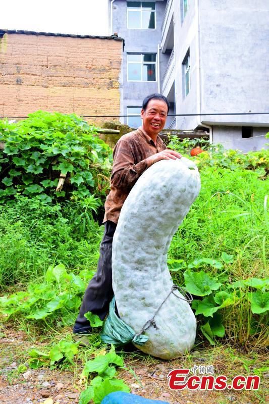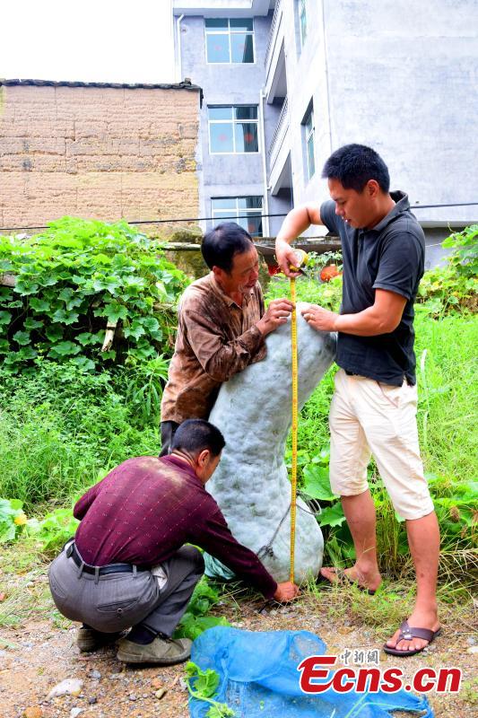 Farmers weigh a giant winter melon in a village of Ningde, East China’s Fujian province. The 150-centimeter-long monster melon weighs up to 86.75 kilograms. [Photo/ Feng Kaihui]