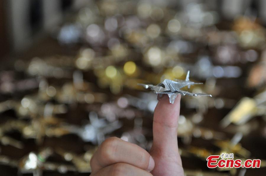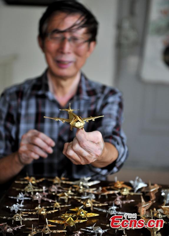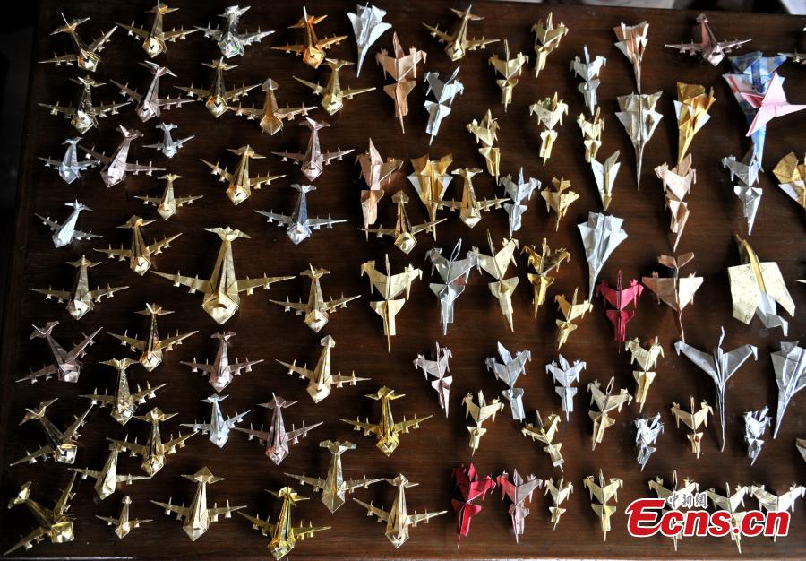 Xu Shuquan, a 70-year-old retired teacher shows mini-size airplanes he made with wastepaper at his home in Chengdu, Sichuan province on Wednesday, September 17, 2014. Xu has made over 10,000 paper airplanes of different types in the past 60 years. The man said he hoped to host an exhibition for all of his origami items, so as to make people know more about the art of Chinese paper folding. [Photo: China News Service/Liu Zhongjun]