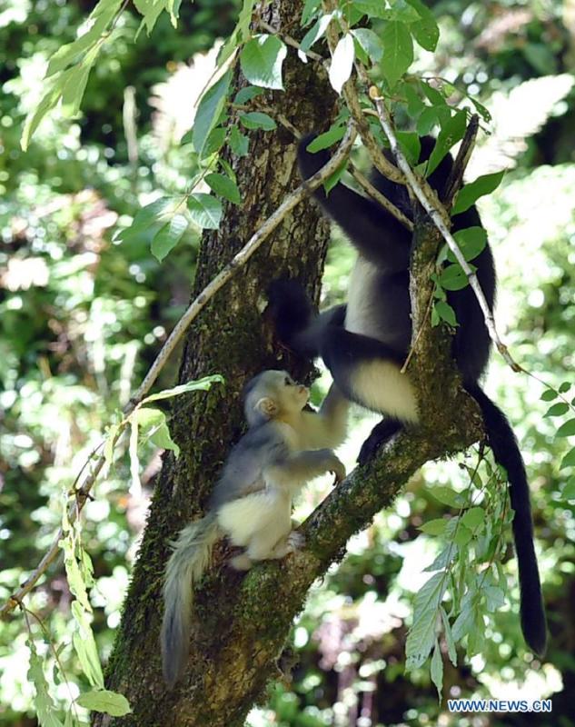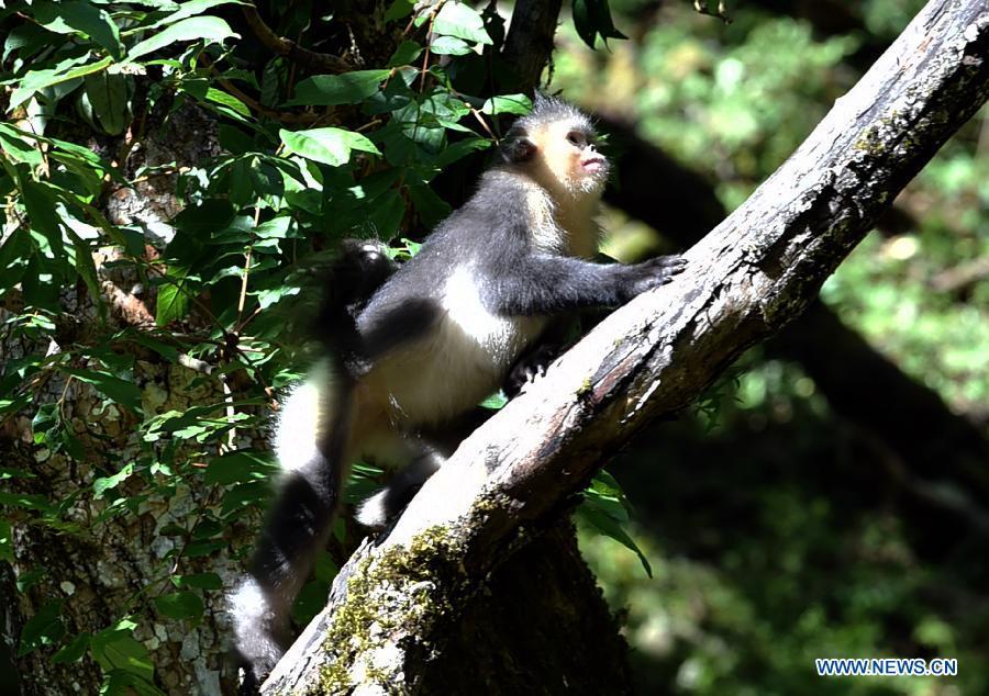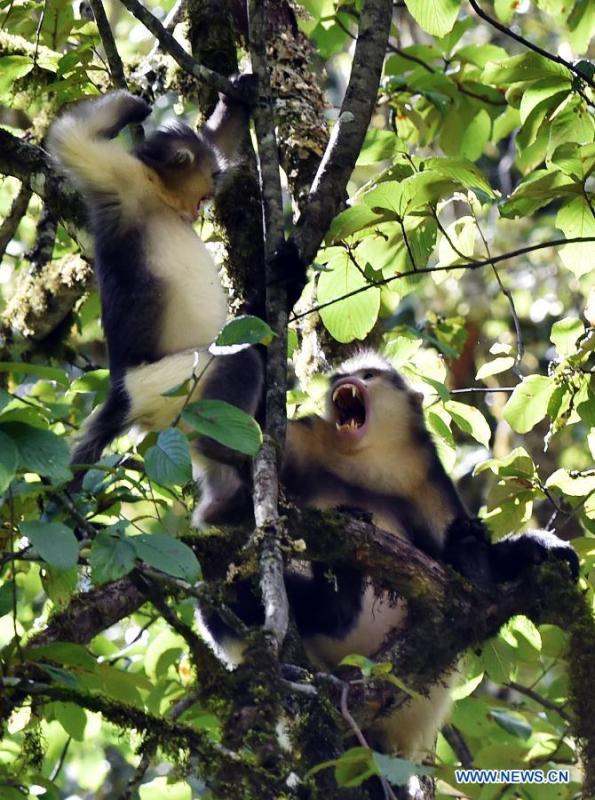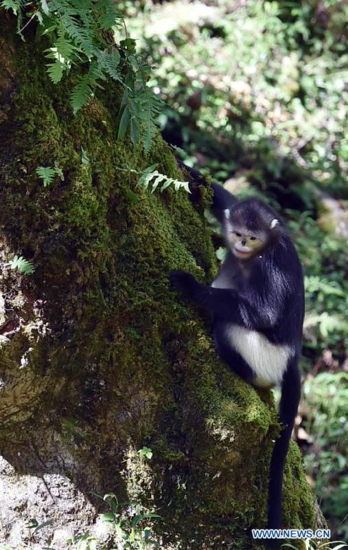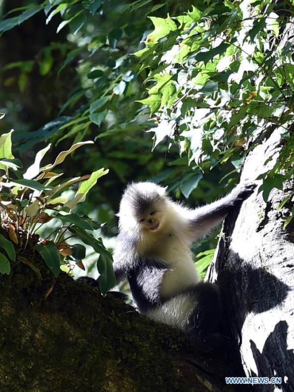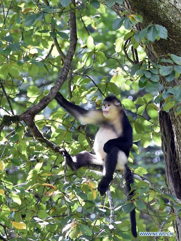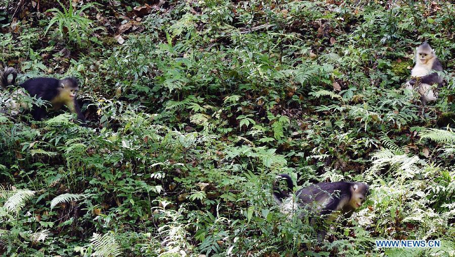 A black snub-nosed monkey (Rhinopithecus bieti) looks for food in the Baimang Mountain National Natural Reserve in the Tibetan Autonomous Prefecture of Deqen in southwest China's Yunnan Province, Sept. 16, 2014. The population of black snub-nosed monkeys within the Baimang Mountain National Natural Reserve has expanded by about 50 as of September. In August 2013, a 5.1-magnitude earthquake in Deqen had exerted adverse effects to the habitats of black snub-nosed monkeys here. Their living environments have been restored under protective efforts that lasted for 12 months. (Xinhua/Chen Haining)