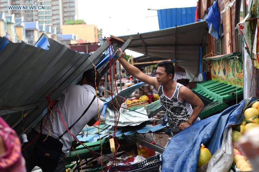 A resident repairs damaged roof after the landfall of Typhoon Kalmaegi in Fangchenggang of south China's Guangxi Zhuang Autonomous Region, Sept. 17, 2014. Typhoon Kalmaegi has left at least seven people dead and one missing and caused huge economic losses since it came ashore in south China on Tuesday. (Xinhua/Lu Boan)