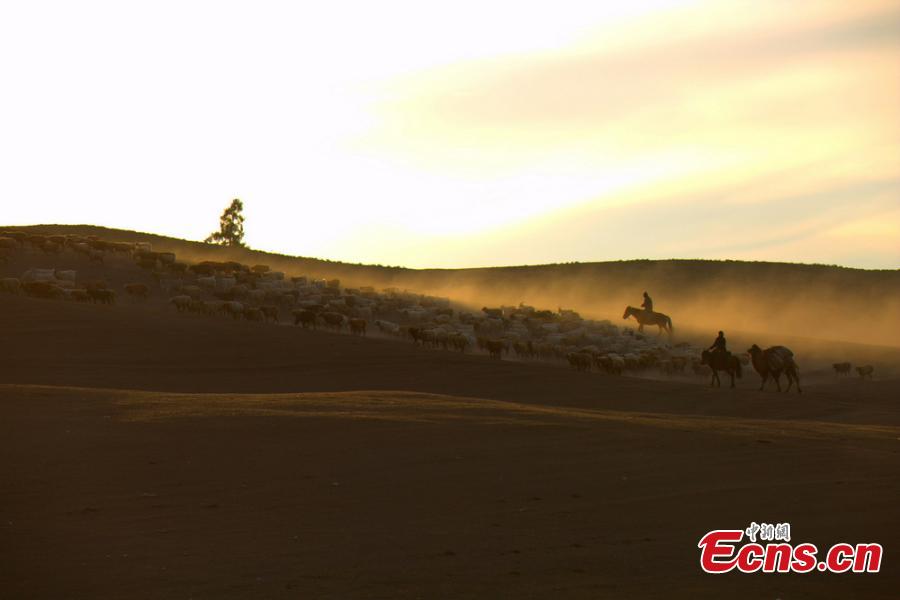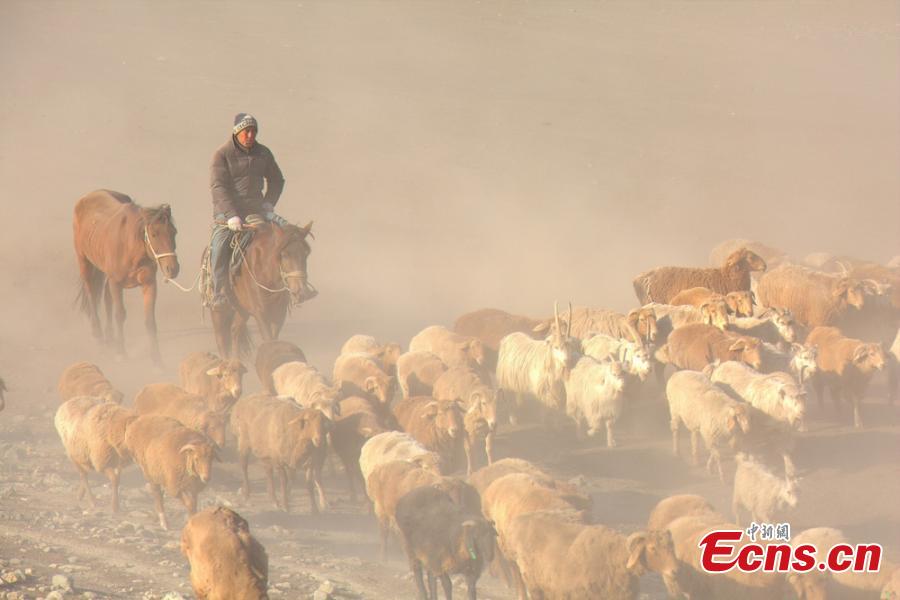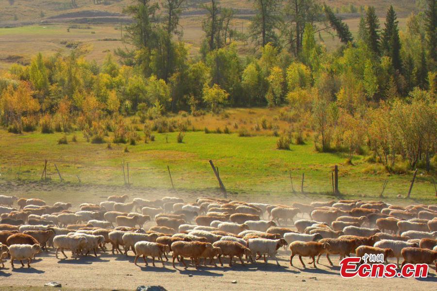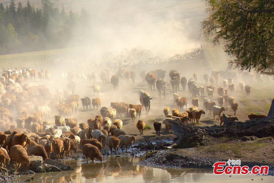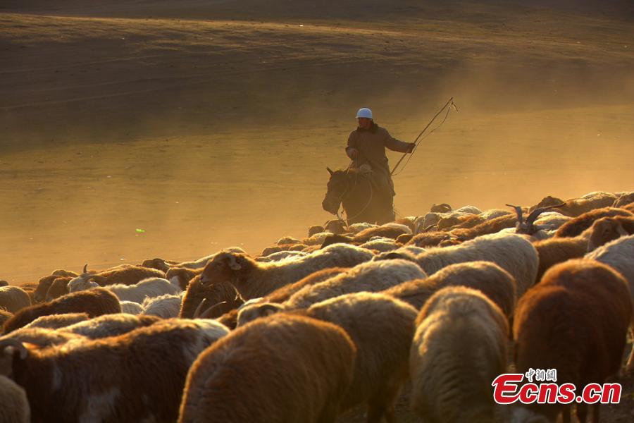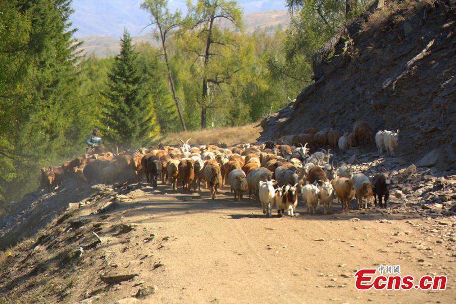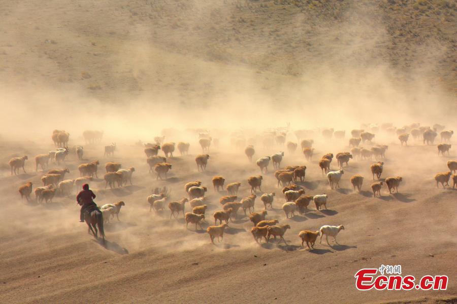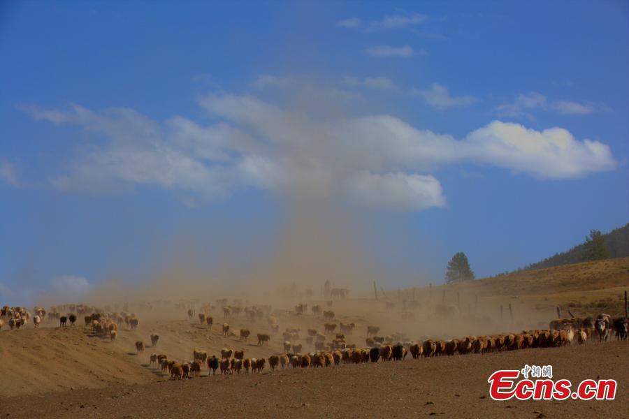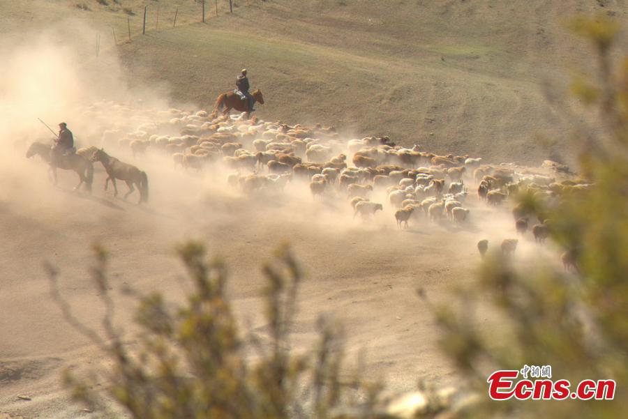 Hundreds of thousands of sheep and cattle are shepherded across grassland during a seasonal livestock migration in Altay, Northwest China's Xinjiang Uygur Autonomous Region in the middle of September, 2014. Local herders who follow a traditional transhumant way of life move their livestock to the cooler highland areas in the spring and summer seasons, and then towards the warmer lowlands in the winter. [Photo/ Liu Shihe]